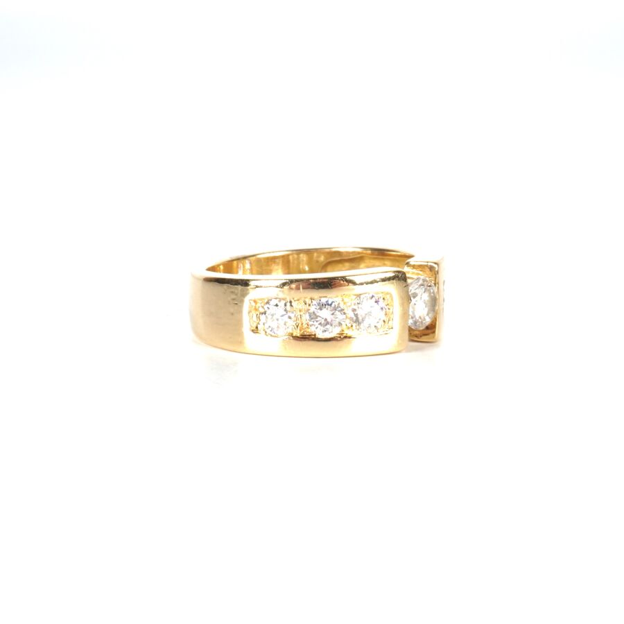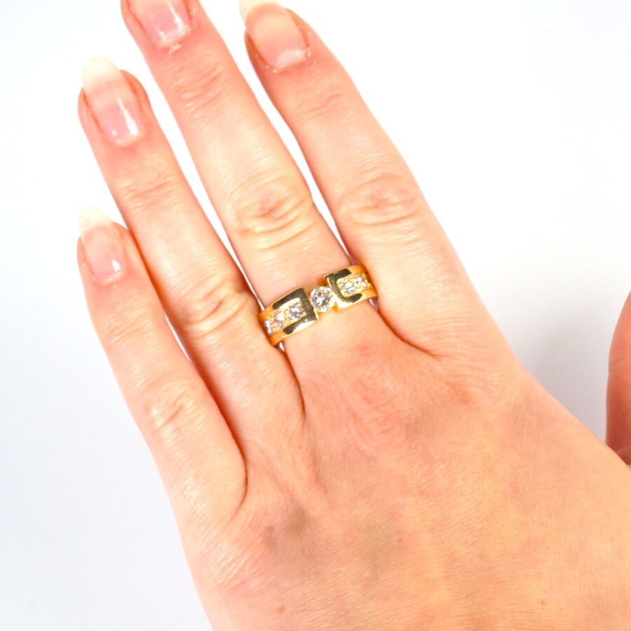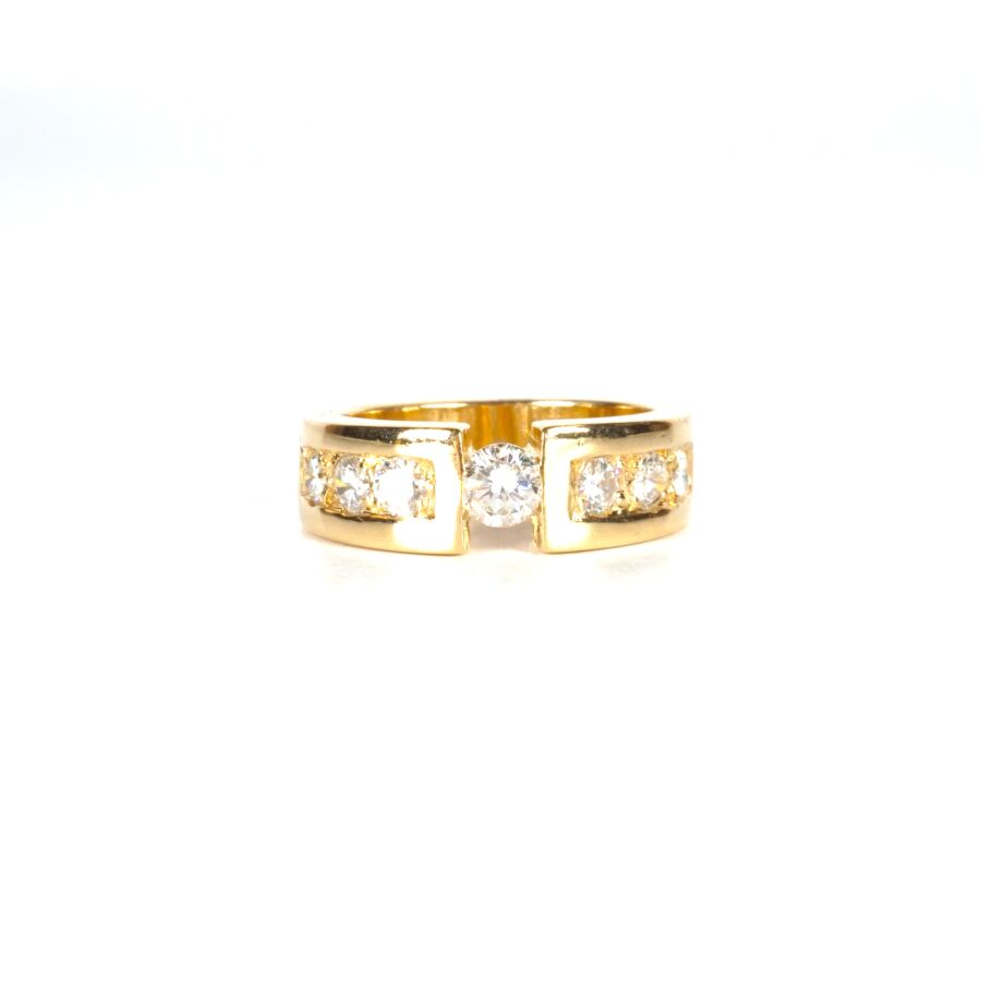 Bague en or jaune 18K (750/oo), l'anneau retenant au centre un diamant taille brillant calibrant 0.4 cts environ (D. 4.7 mm), chaque ligne sertie de 2x3 diamants taille brillant calibrant au total 0.7 cts environ, Larg. 7 mm. TDD. 58. Poids brut : 9.8 g environ (AC).