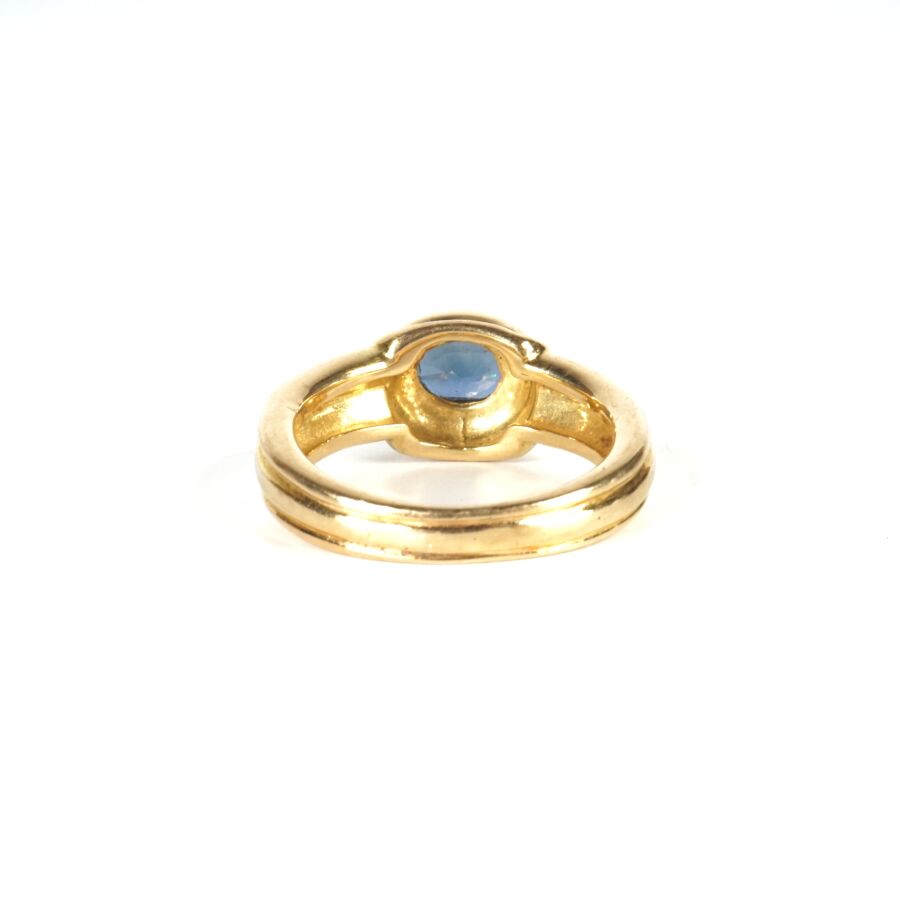 Bague en or jaune 18K (750/oo) les montants formés de trois anneaux, sertie d'un saphir de couleur bleue de taille ovale (D. 6.5/7 x 5 mm), TDD. 52.5/53. Larg. 8 mm. Poids brut : 6.6 g environ.