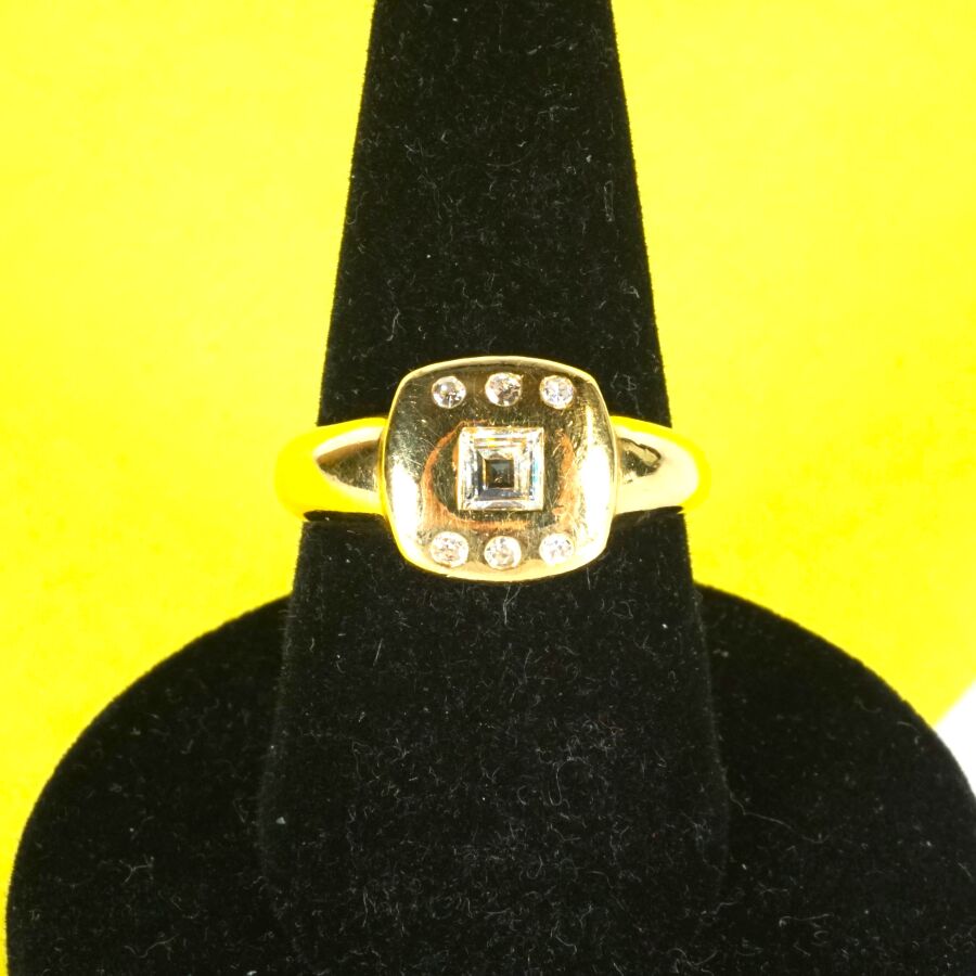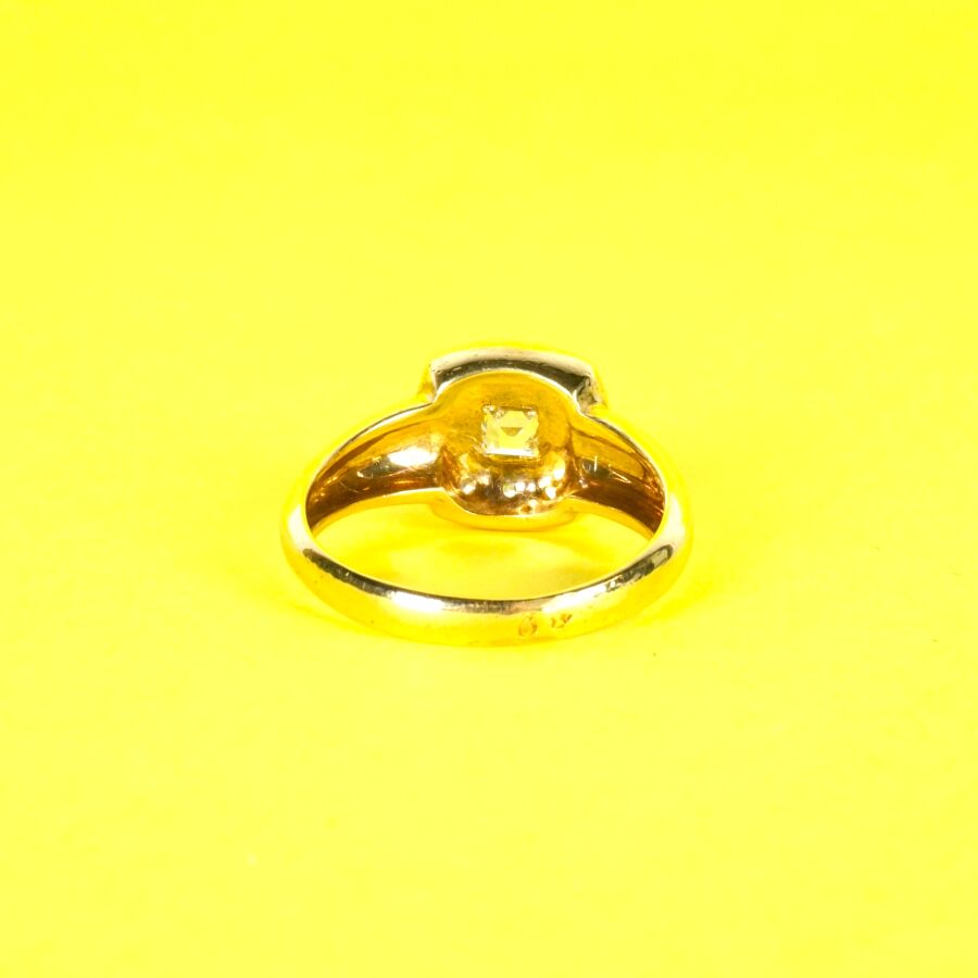 Bague en or jaune 18K (750/oo), plateau de forme carrée serti au centre d'un diamant taille princesse calibrant 0.4 cts environ (4x4 mm) dans un entourage de 6 diamants calibrant au total 0.18 cts (D. 1.5 mm), Dim. Tête de bague : 1.1 x 1.2 cm. TDD. 63. Poids brut : 7.5 g environ.