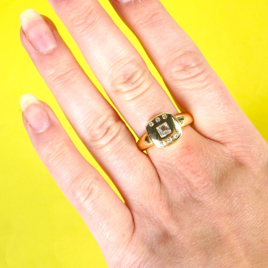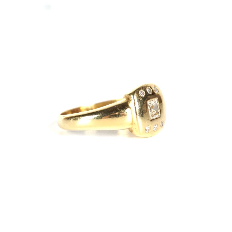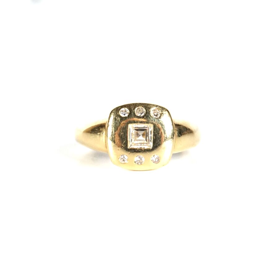 Bague en or jaune 18K (750/oo), plateau de forme carrée serti au centre d'un diamant taille princesse calibrant 0.4 cts environ (4x4 mm) dans un entourage de 6 diamants calibrant au total 0.18 cts (D. 1.5 mm), Dim. Tête de bague : 1.1 x 1.2 cm. TDD. 63. Poids brut : 7.5 g environ.