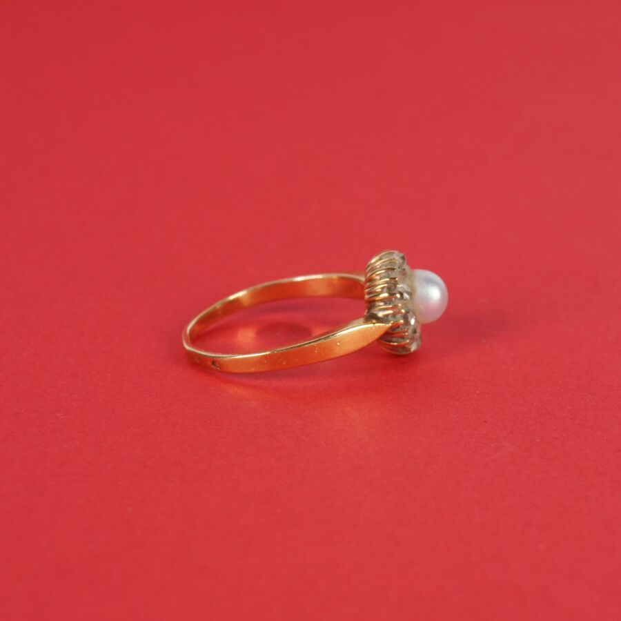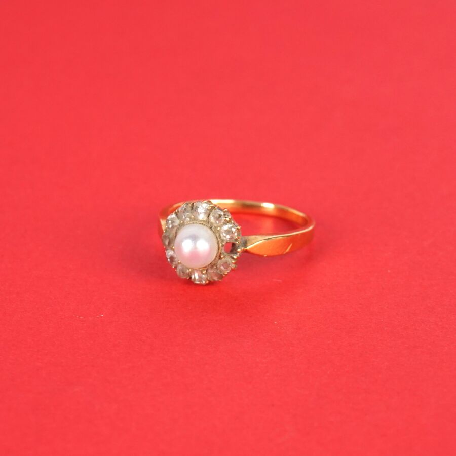 Bague en or jaune 18K (750/oo), poinçon tête de cheval (1838-1919), sertie au centre d'une perle (D. 0.5 mm environ), dans un entourage de 12 diamants taille rose (un manque), TDD. 54. Poids brut : 3.2 g environ.
