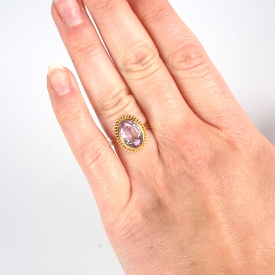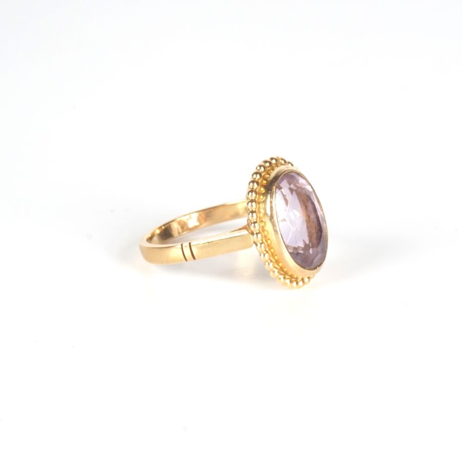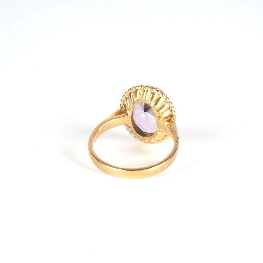 Bague en or jaune 18K (750/oo), sertie d'une améthyste de taille ovale (D. 1.1 x 0.8 cm) en serti clos dans un entourage d'une frise perlée, TDD. 51. Poids brut : 4.5 g environ (quelques petites égrisures).