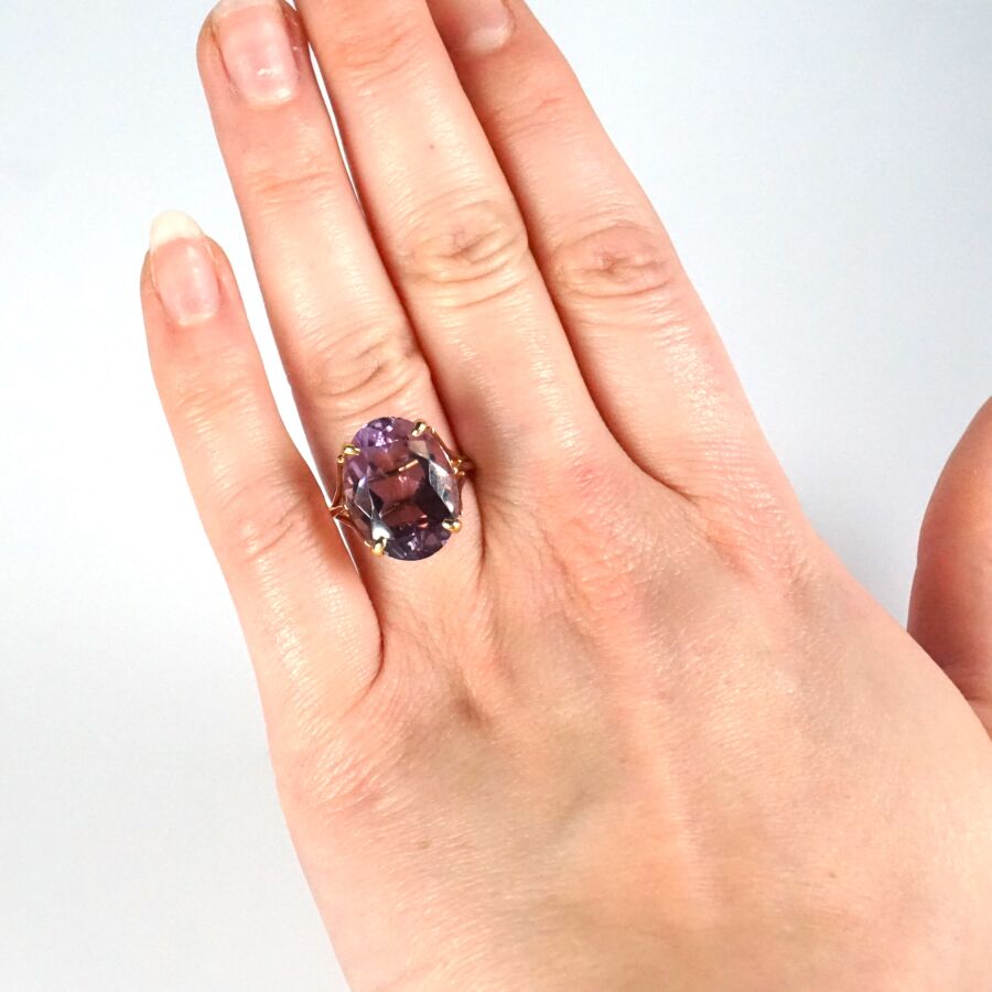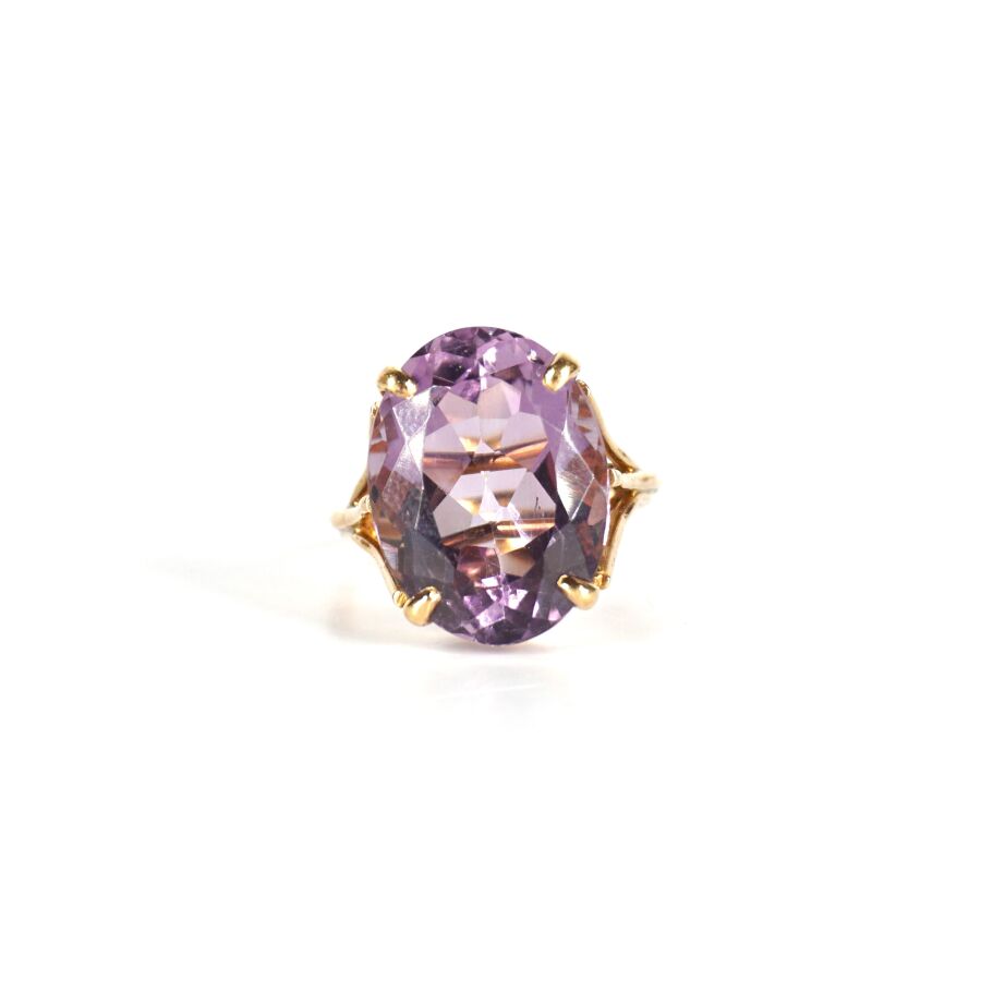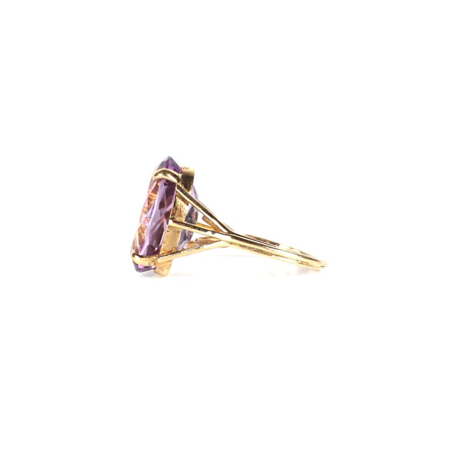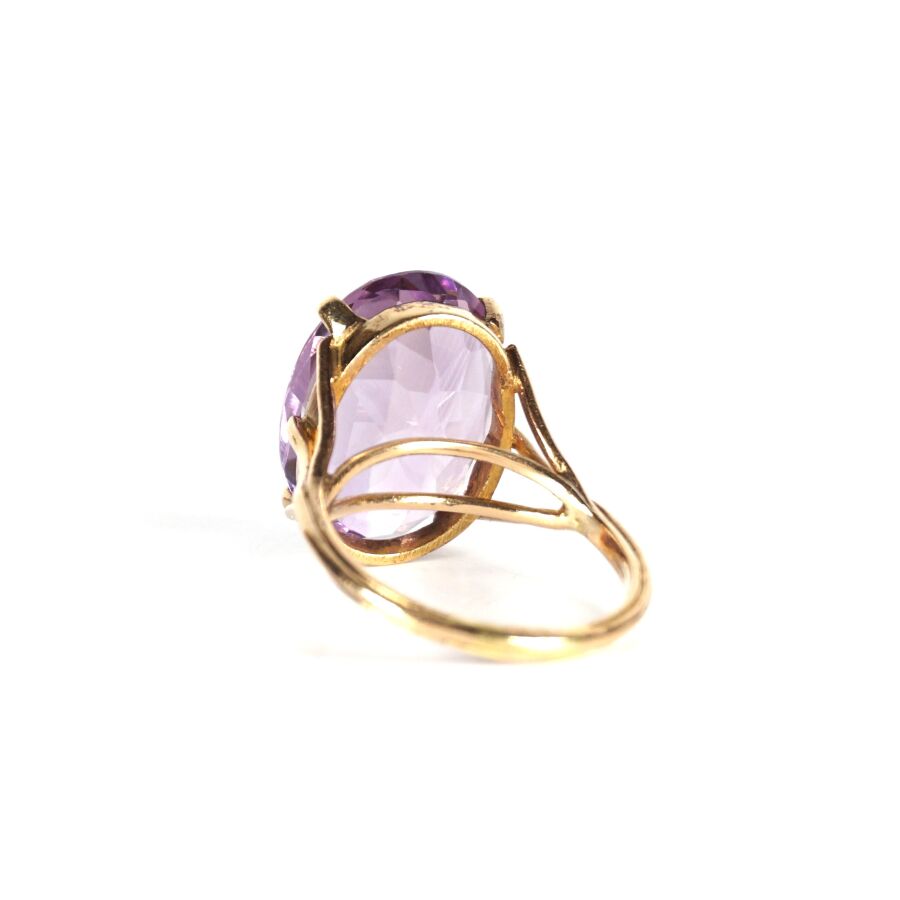 Bague en or jaune 18K (750/oo) sertie d'une importante améthyste facettée de taille ovale (D. 1.7 x 1.3 cm), montants triples, TDD. 54. Poids brut : 6.3 g environ.
