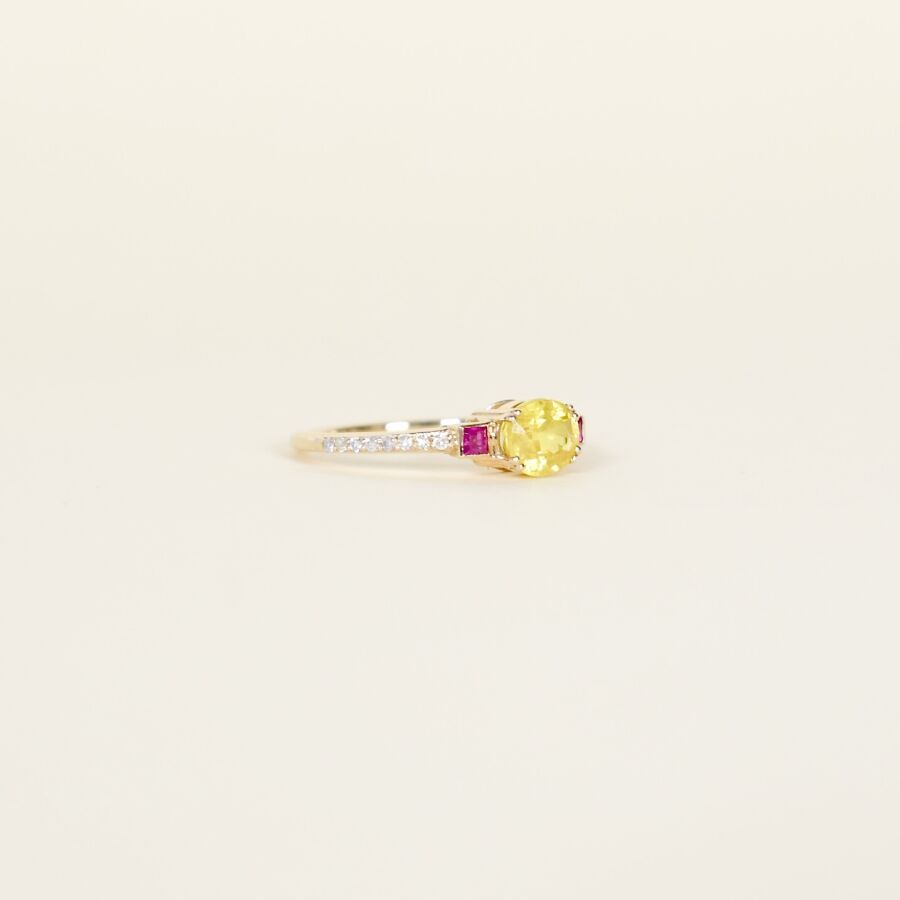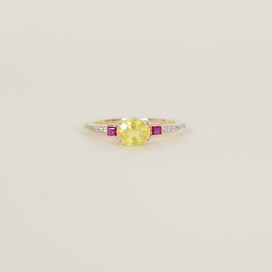 Bague en or jaune 9K (375/oo), ornée d'un saphir jaune central taille ovale, calibrant 1.3 ct environ, épaulé de deux rubis carrés en serti clos pour environ 0.1 ct, l'anneau orné de diamants pour 0.1 ct environ, TDD : 54. Poids brut : 1.8 g environ.