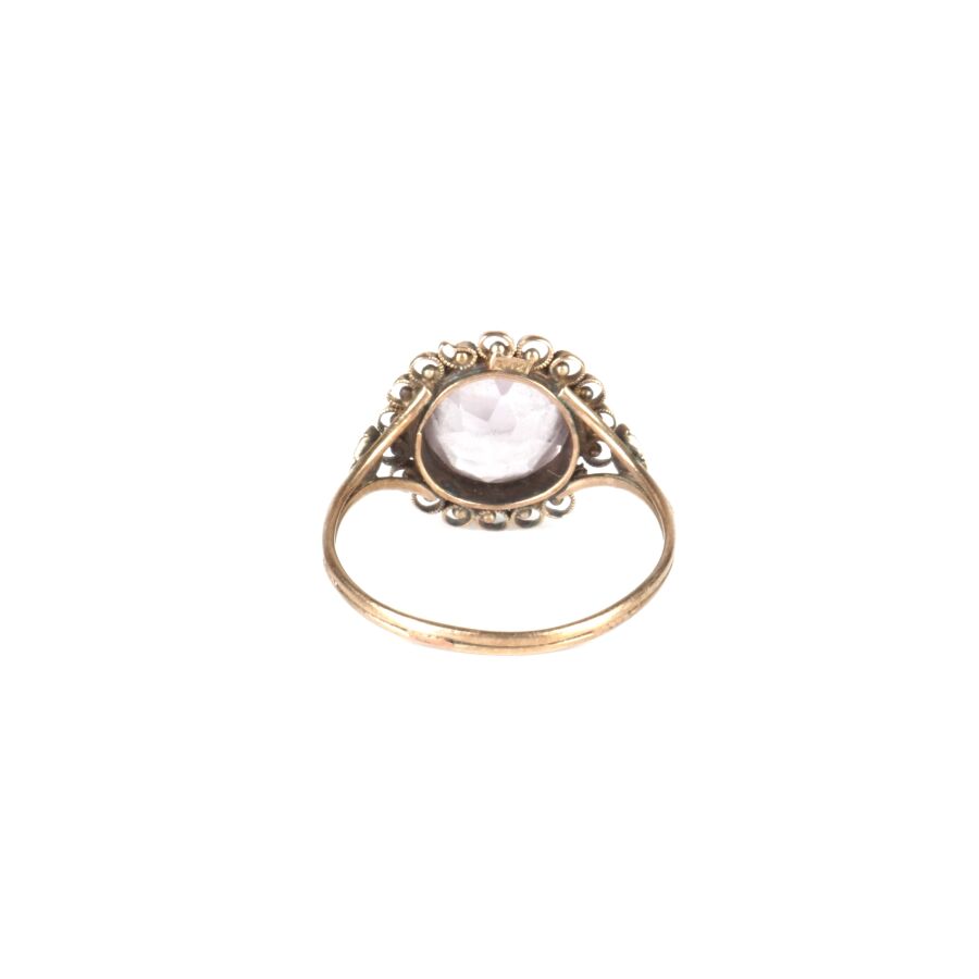 Bague en or jaune 9K (375/oo) sertie d'une améthyste facettée taille ronde (D. 8 mm) dans un entourage ajouré, TDD. 53. Poids brut : 1.9 g environ (rayures, petits manques).