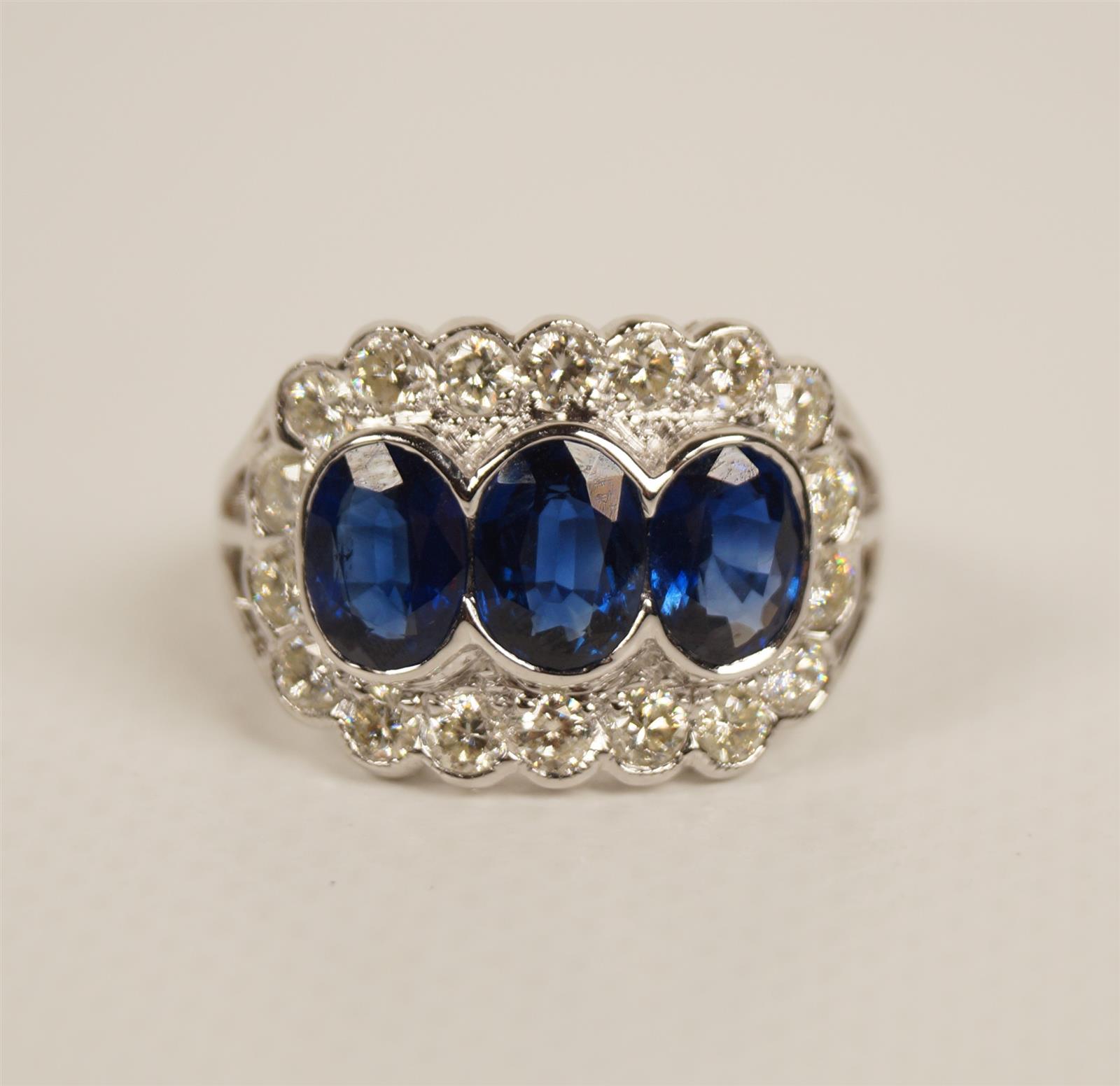 Bague en or rhodié, sertie de 3 saphirs taille ovale, 2.90 cts environ, entourés de 18 diamants blancs taille moderne, 0.95 ct environ, TDD : 54.5. Poids brut : 6.45 g environ.