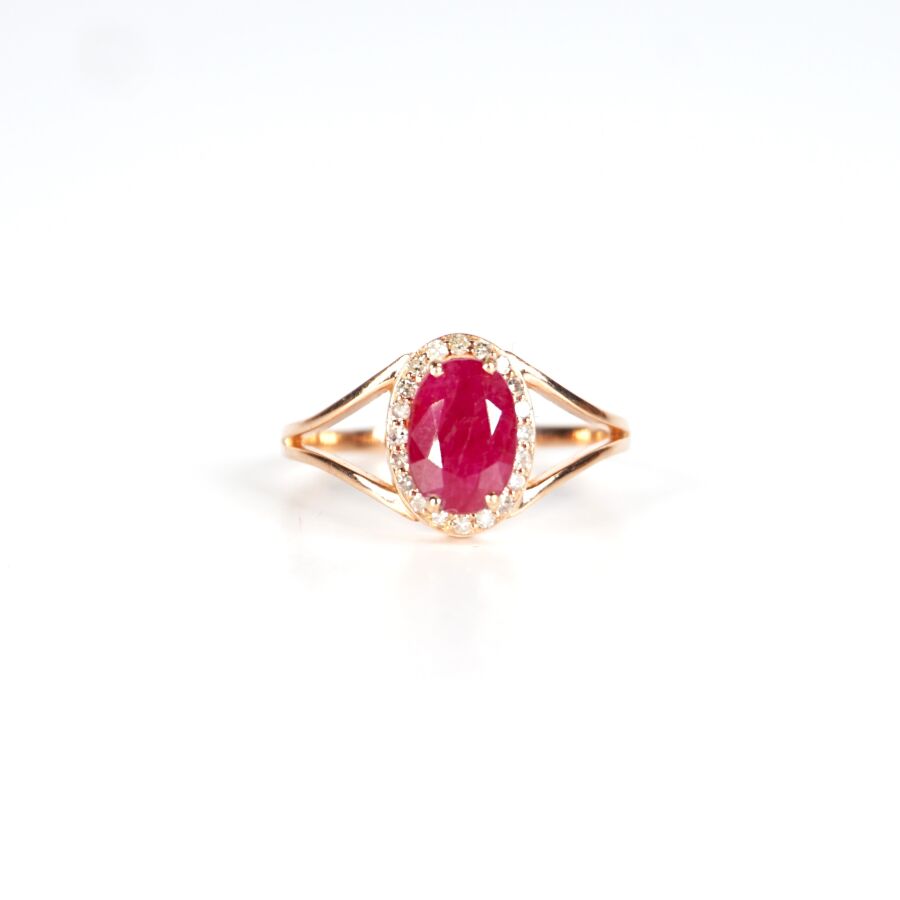 Bague en or rose 9K (375/oo), sertie d'un rubis de taille ovale calibrant 2 cts dans un entourage de petits diamants calibrant ensemble 0.10 cts environ, Larg. 1.1 cm. TDD. 55. Poids brut : 2.3 g environ.