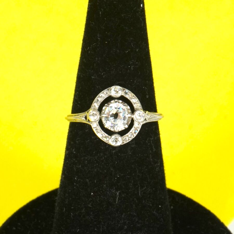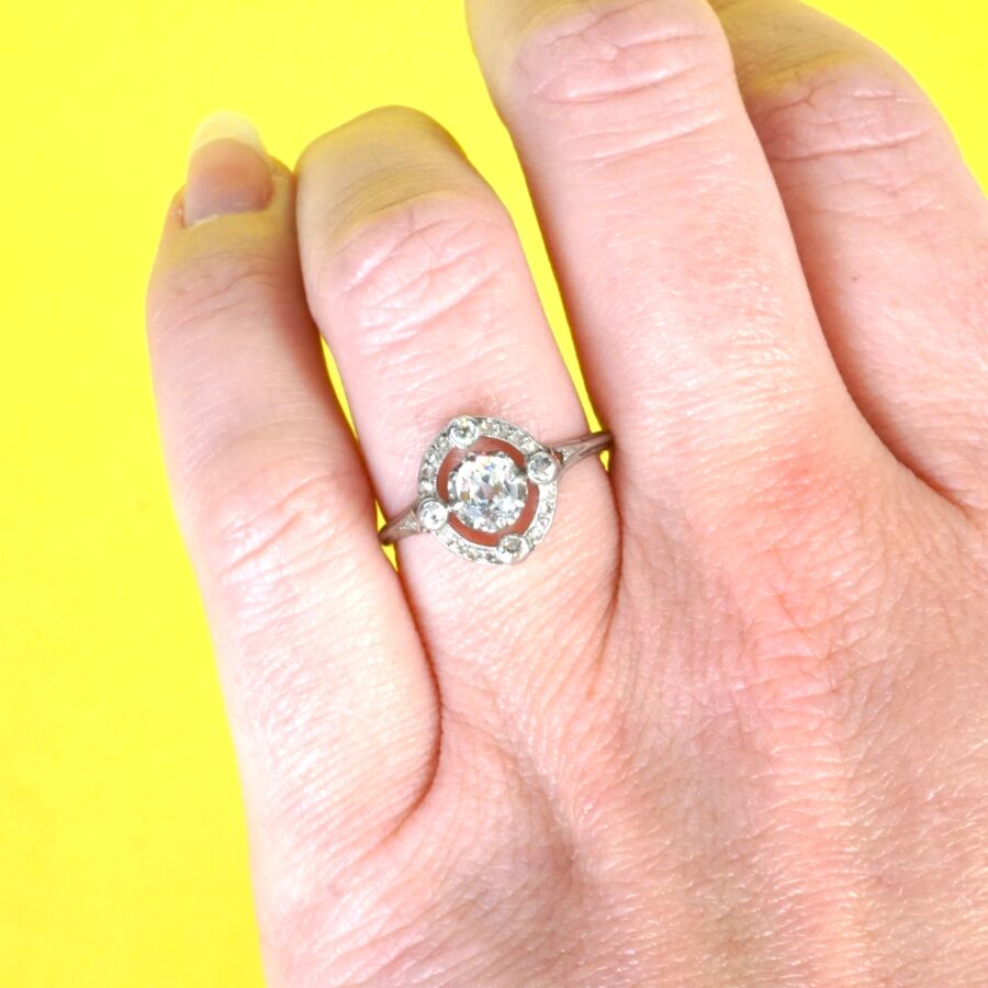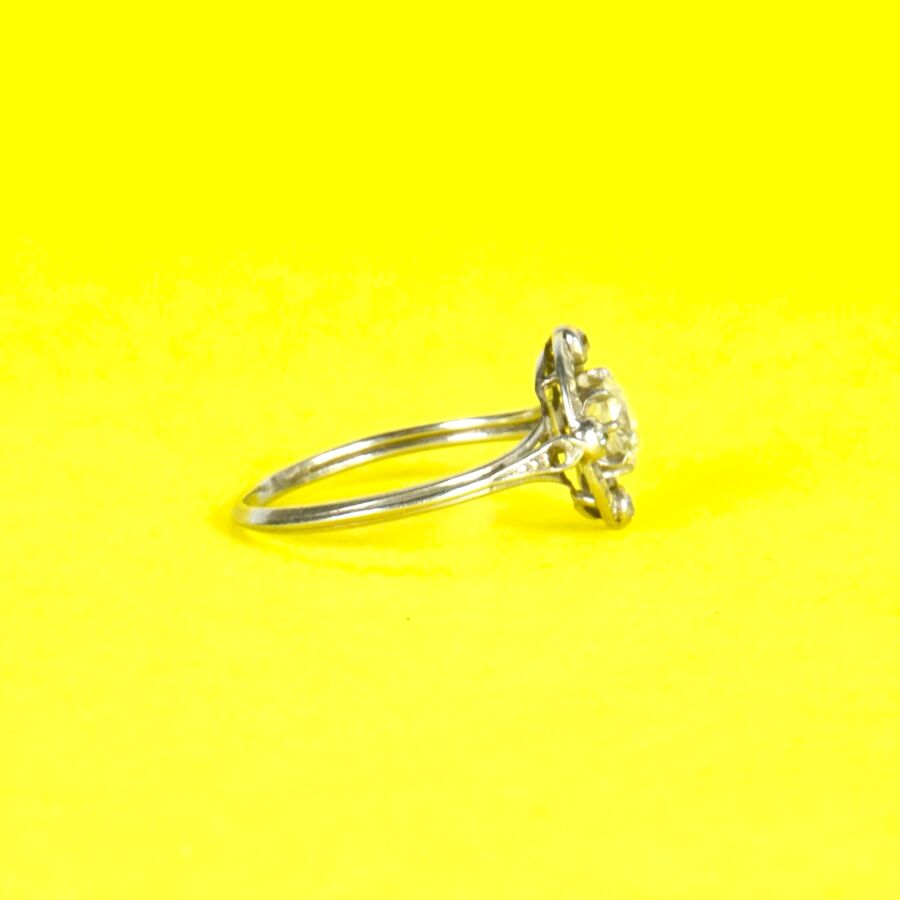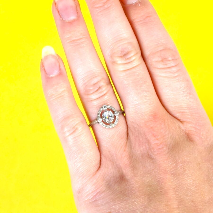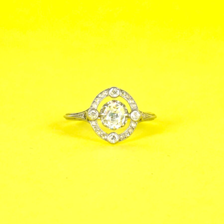 Bague en platine (850/oo), plateau ovale ajouré serti au centre d'un diamant taille ancienne de forme ronde calibrant 0.45 ct environ (D. 5 mm), dans un entourage de 4 diamants ronds calibrant 0.02 ct environ chaque et de 16 petits diamants taille rose, Dim. Tête de bague : 1.1 x 1.1 cm. TDD. 53. Poids brut : 2.1 g environ.