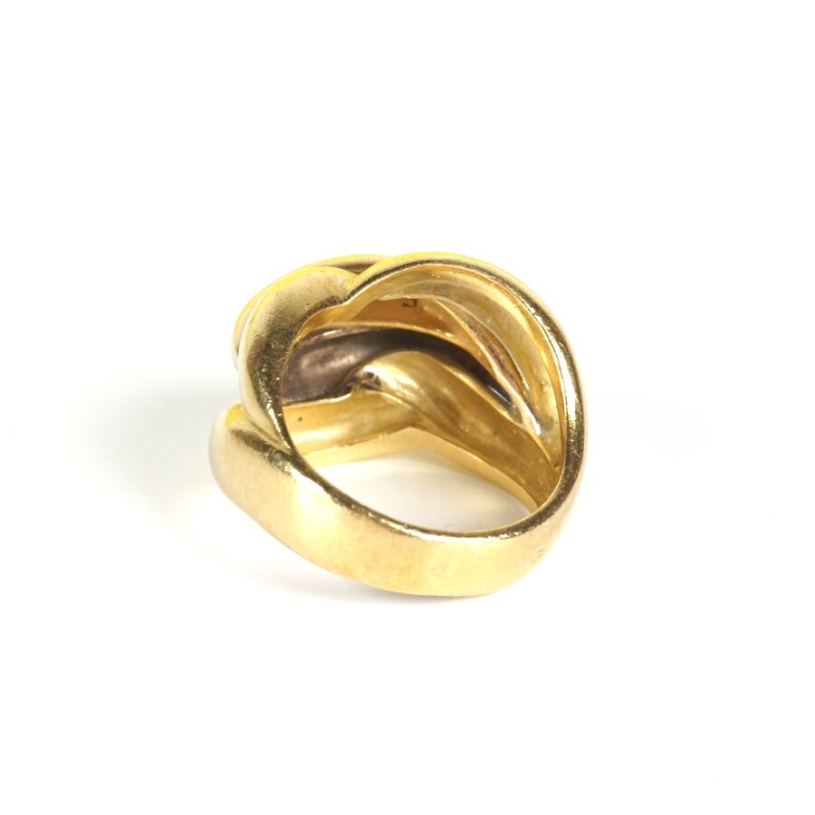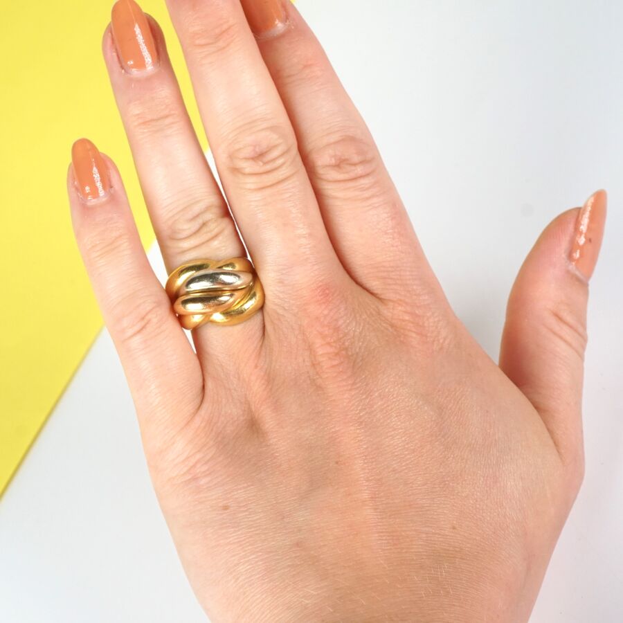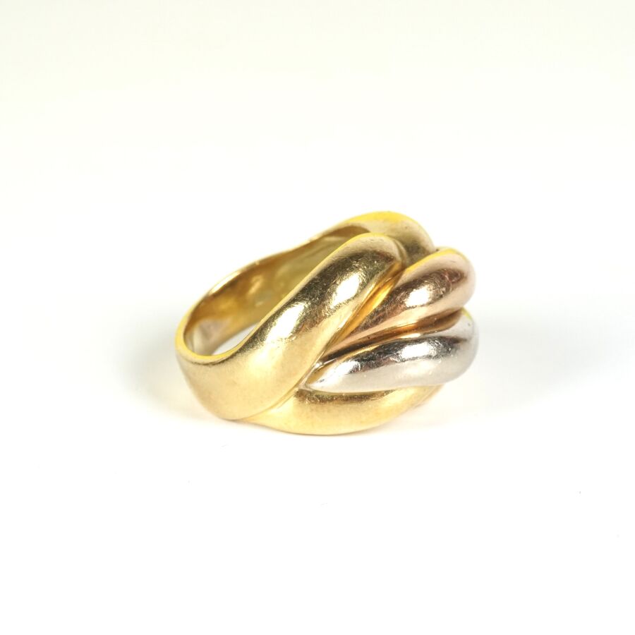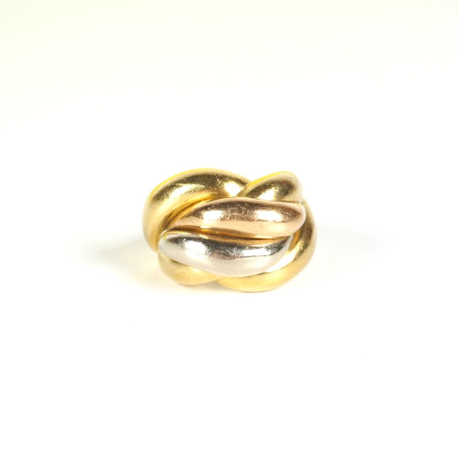 Bague entrelacée, 3 ors 18K (750/oo), TDD. 52/52.5. Dim. Tête de bague : 2.3 x 1.5 cm. Poids brut : 10.9 g environ.