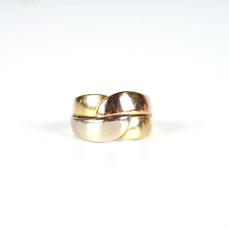 Bague "entrelacée" en or 3 tons 18K (750/oo), Larg. 1.2 cm. TDD. 54/54.5. Poids brut : 9.9 g environ.