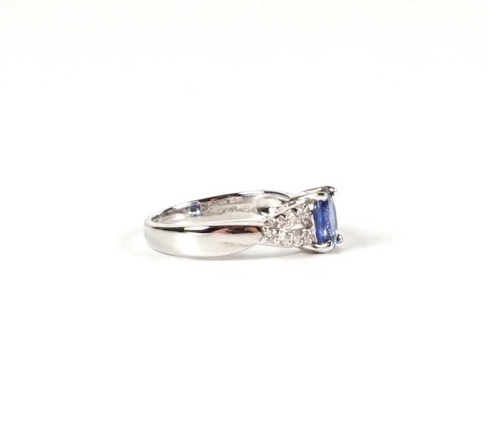 Bague entrelacée en or blanc 18 K (750/oo) sertie d'un saphir taille ovale pesant 0.90 ct, épaulé de 12 diamants blancs taille moderne pour 0.15 ct. TDD 53. Poids brut : 3.75 g environ.