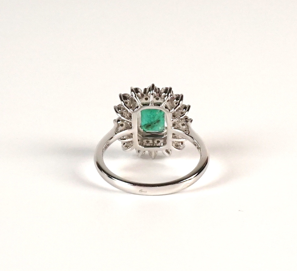Bague "Fleur" en or gris 18 K (750/oo) ornée au centre d'une émeraude taille émeraude pesant 1.8 ct, agrémentée de deux lignes de petits diamants pesant 1.3 cts. TDD 52.5. Poids brut : 4.4 g environ.