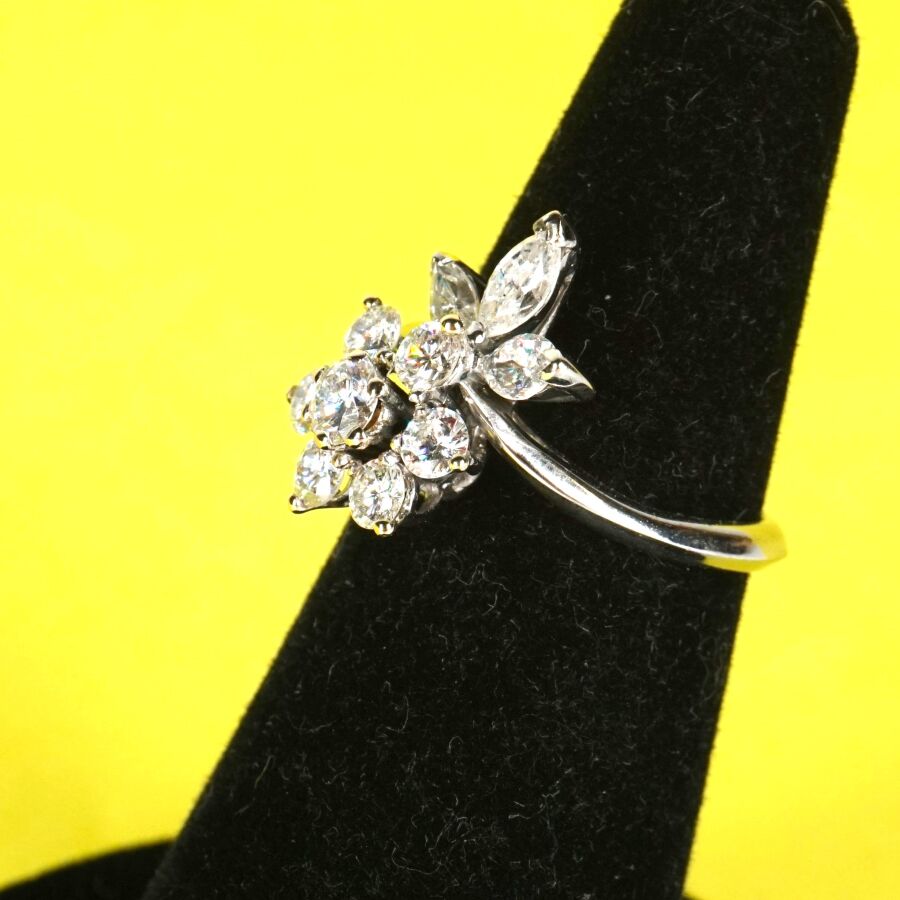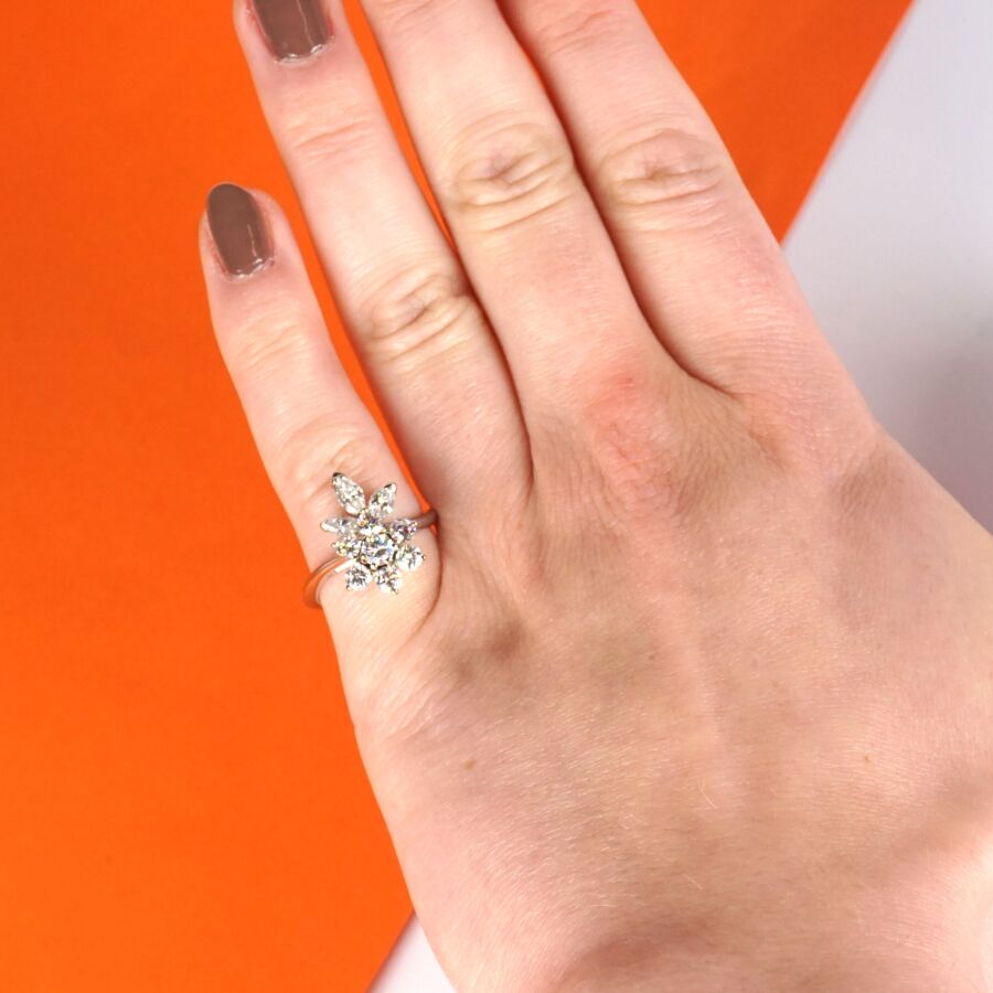 Bague "Fleur" en or gris 18K (750/oo) à motif d'une rosace sertie de 7 diamants taille brillant, le diamant central calibrant 0.2 ct environ et les 6 diamants formant pétales calibrant 0.11 ct chaque environ, encadré de 3 diamants taille navette calibrant ensemble 0.4 ct environ, TDD. 51. Poids brut : 4.3 g environ.