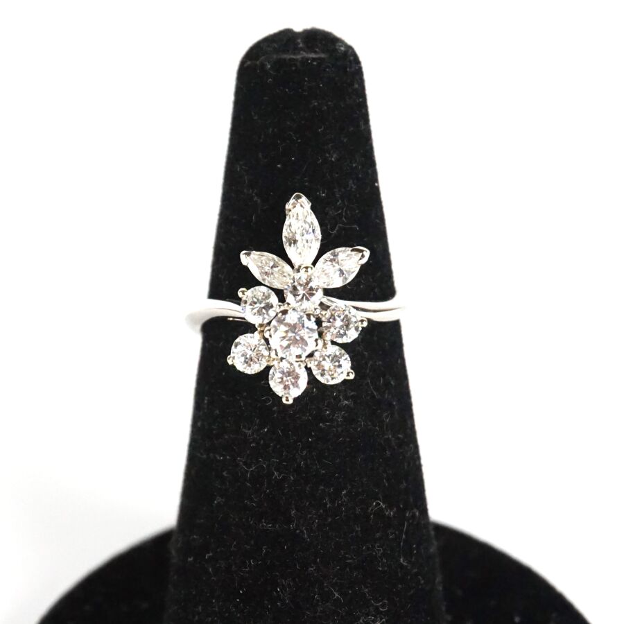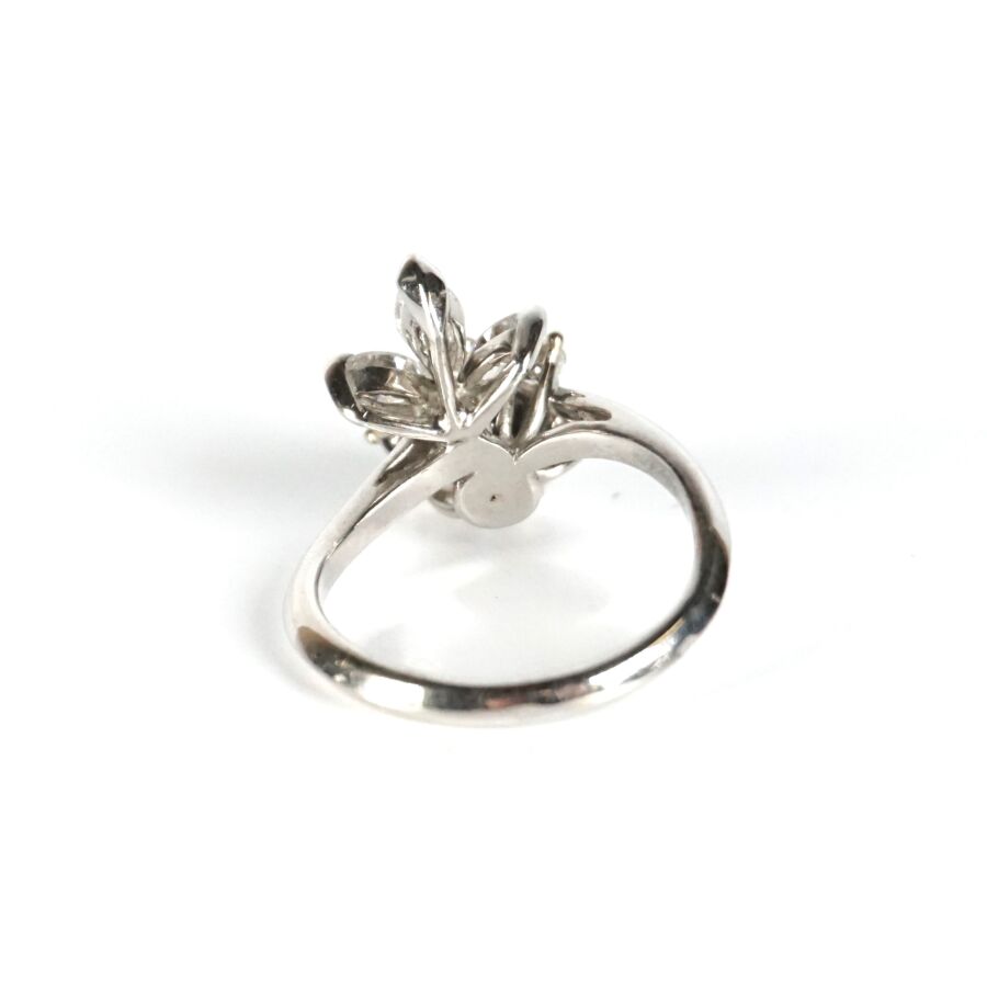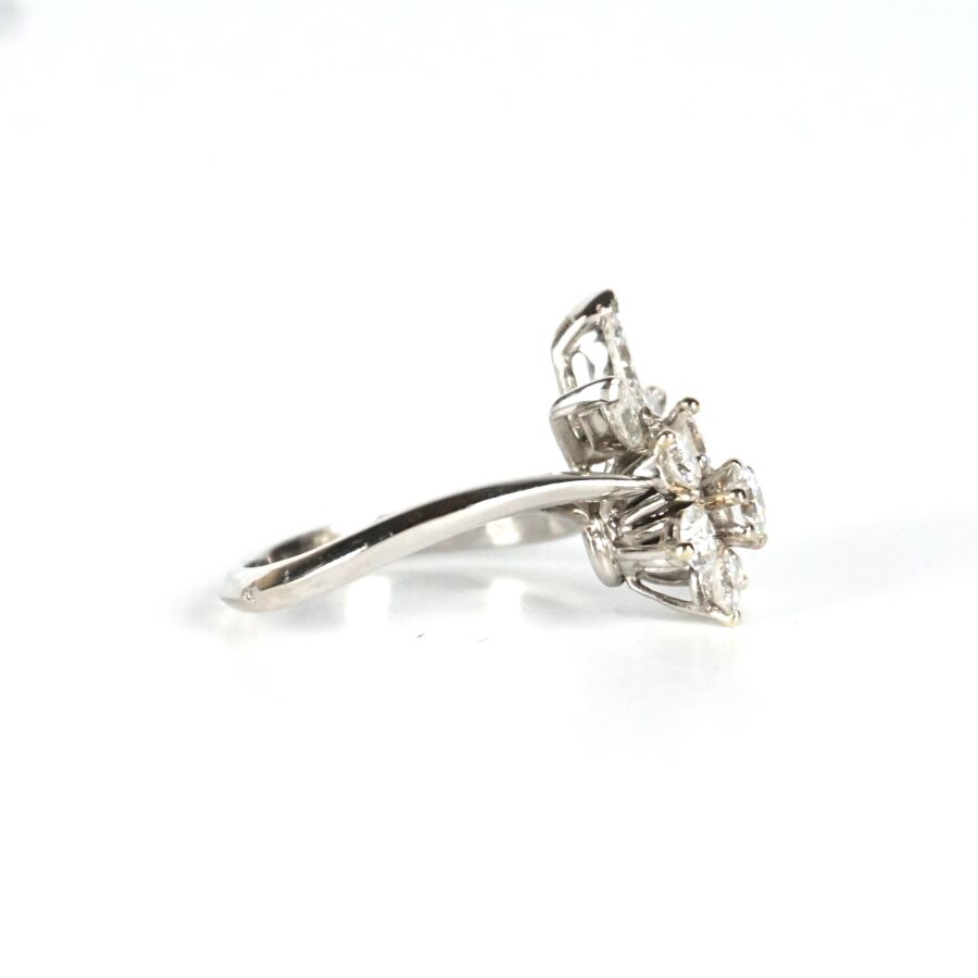Bague "Fleur" en or gris 18K (750/oo) à motif d'une rosace sertie de 7 diamants taille brillant, le diamant central calibrant 0.2 ct environ et les 6 diamants formant pétales calibrant 0.11 ct chaque environ, encadré de 3 diamants taille navette calibrant ensemble 0.4 ct environ, TDD. 51. Poids brut : 4.3 g environ.