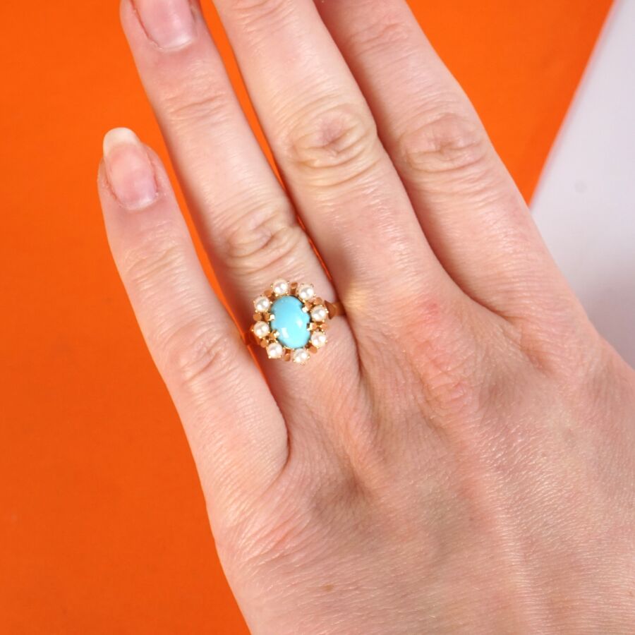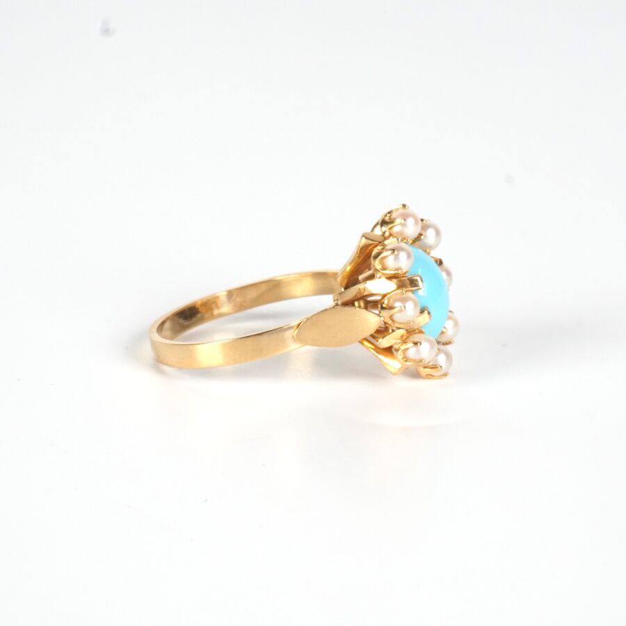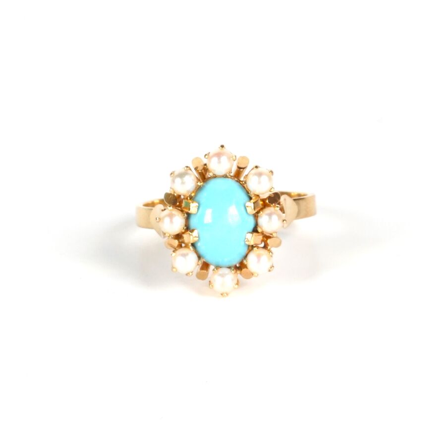 Bague "Fleur" en or jaune 18K (750/oo), sertie d'une turquoise taille cabochon de forme ovale (D. 9 x 6 mm) dans un entourage de 8 petites perles blanches (D. 2/2.5 mm), TDD. 54.5/55. Poids brut : 4 g environ.