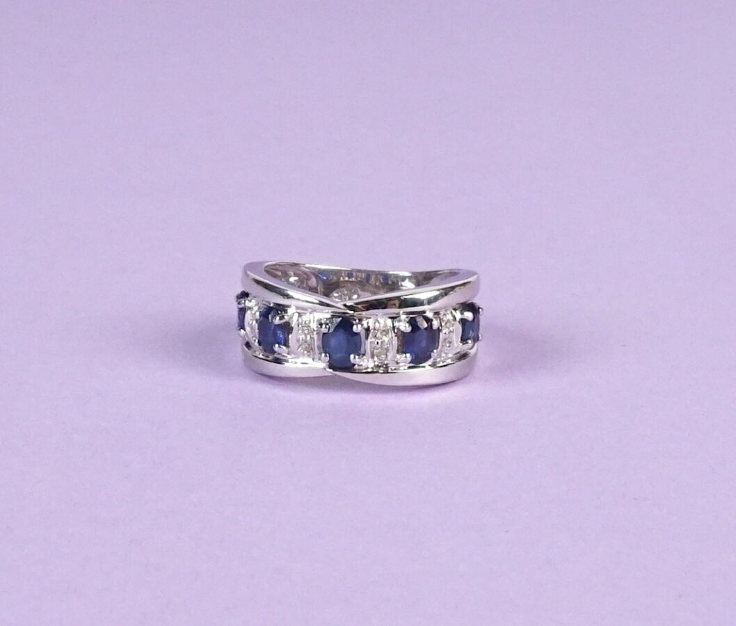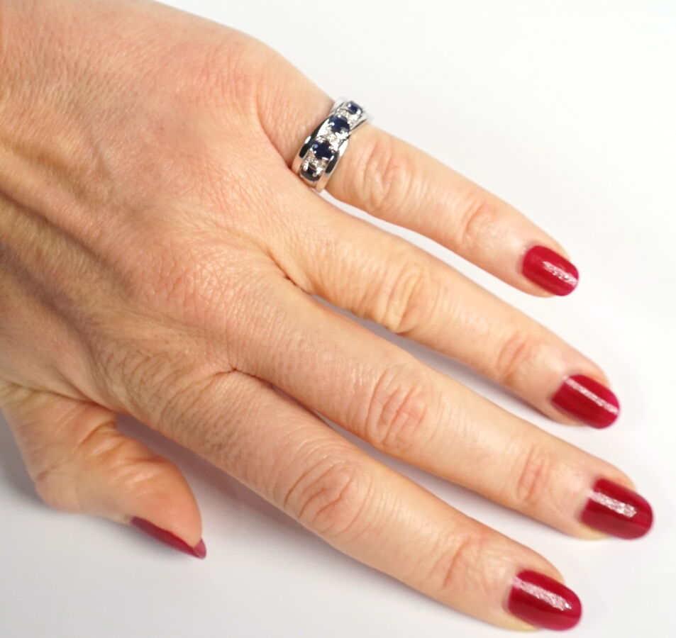 Bague "Jarretière" en or blanc 18K (750/oo), de forme légèrement cintrée, sertie de 5 saphirs taille ovale calibrant ensemble 1.50 carat, alternés de 2 x 4 diamants ronds pour 0.10 carat. TDD 49. Poids brut : 4.4 g environ.