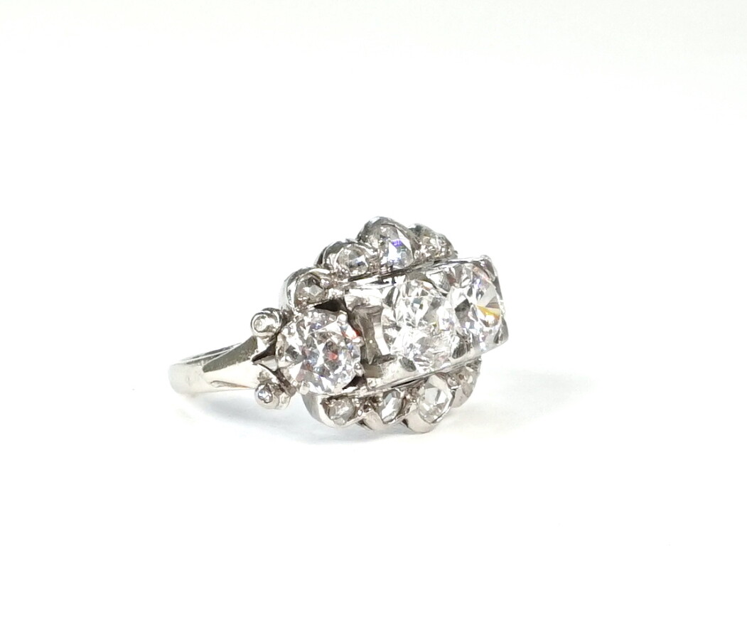 Bague "Jarretière" en or gris 18K (750/oo) et platine (950/oo), sertie d'une ligne de 4 pierres rondes imitant le diamant (D. 5 et 6 mm), dans un entourage festonné serti de diamants taille rose. Poinçon de Maître "MM". Dim. du motif : 2.4 x 1.5 cm. (Probables remontages, la ligne centrale devait être initialement sertie de diamants, les 2 pierres centrales légèrement mobiles). TDD 53. Poids brut : 7.3 g environ.