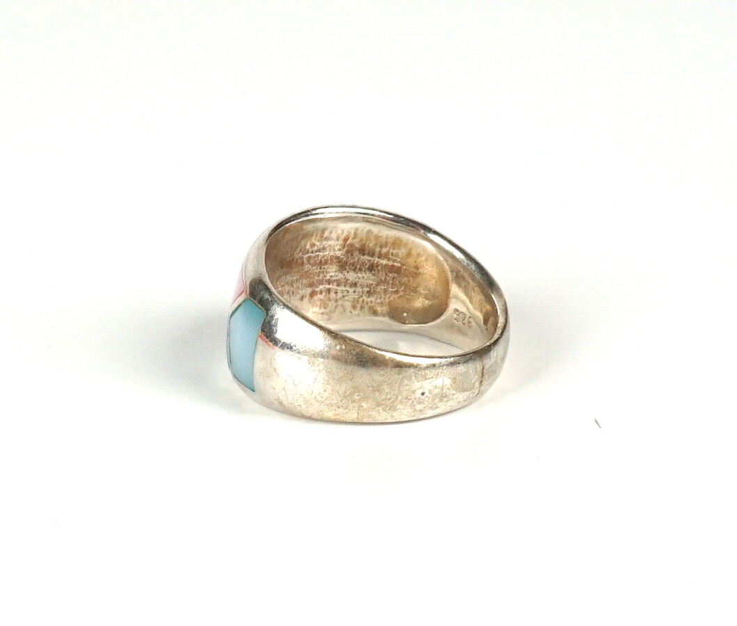 Bague "Jonc" en argent (925/oo) agrémentée de nacre rose et bleue, Lar. du motif : 1.1 cm. TDD 58. Poids brut : 7.2 g environ.