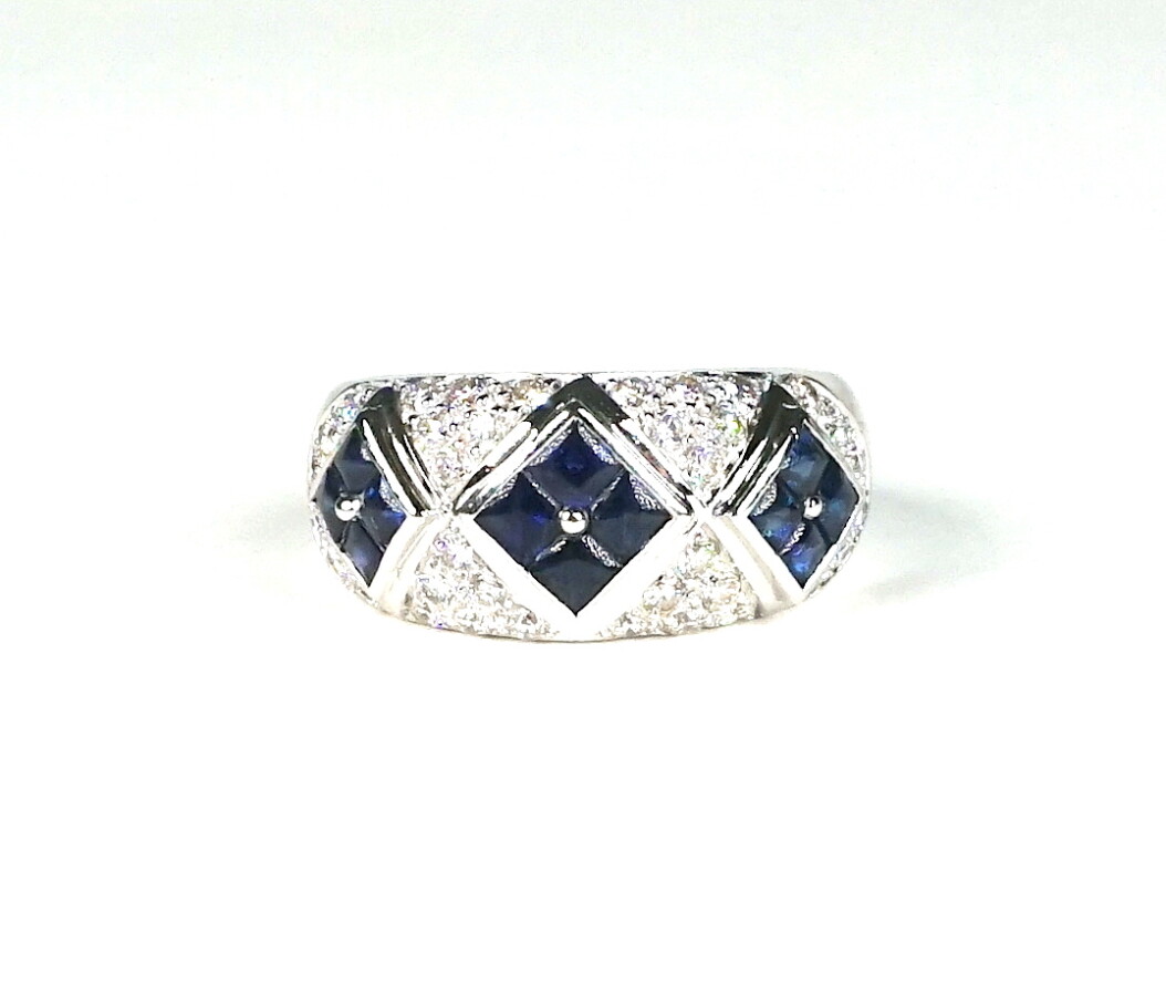 Bague "Jonc" en or blanc 18K (750/oo) ornée de 3 motifs losangés sertis chacun de 4 saphirs calibrés, dans un entourage pavé de petits diamants ronds. Lar. du motif : 1.1 cm. TDD 53. Poids brut : 11.15 g environ.