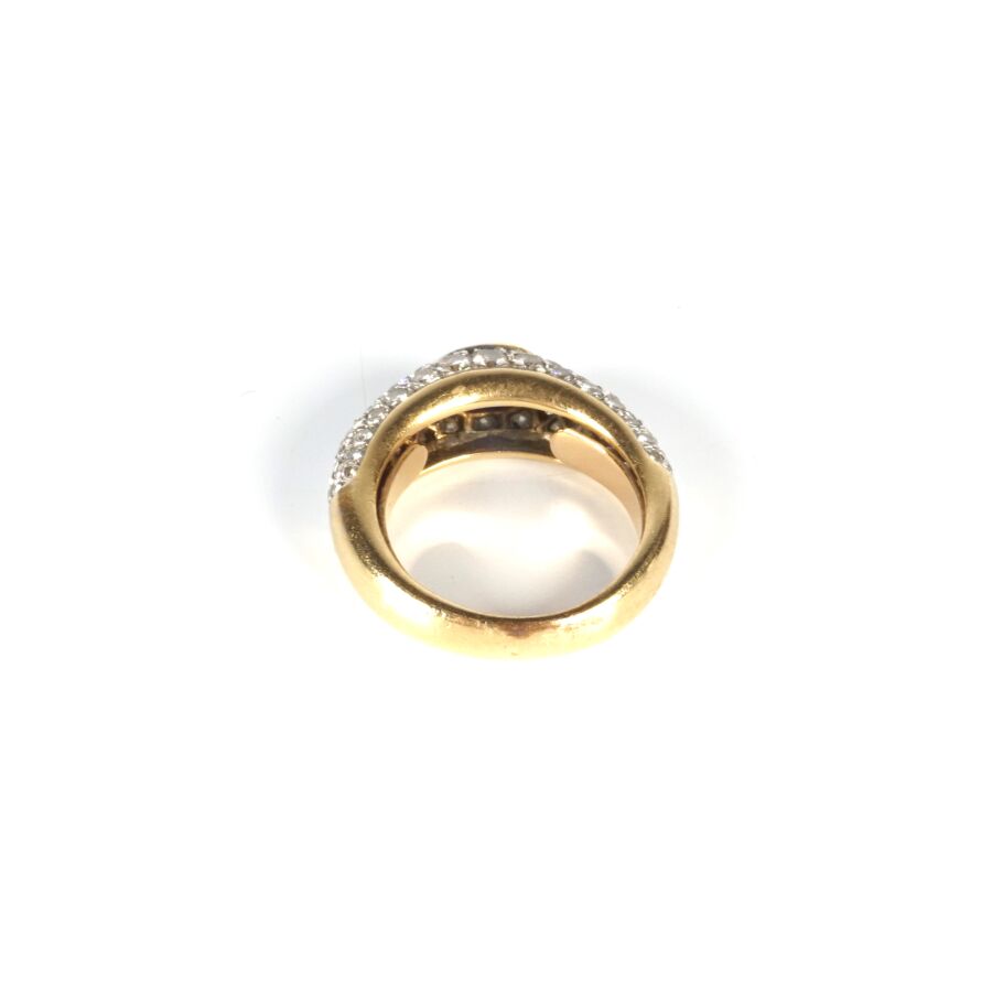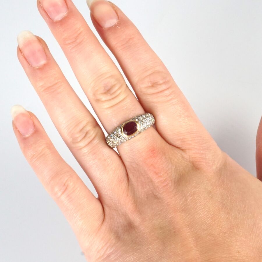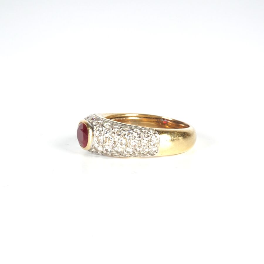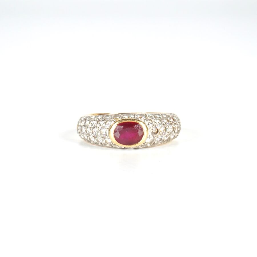 Bague jonc en or jaune 18K (750/oo), anneau bombé serti au centre d'un rubis de taille ovale (D. 6 x 4.8 mm) dans un entourage de 70 diamants ronds (D. de 1 mm à 2 mm), TDD. 57. Larg. 7 mm. Poids brut : 8.8 g environ (égrisures au rubis).