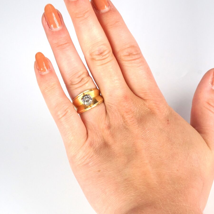 Bague jonc en or jaune 18K (750/oo) et platine (850/oo), sertie quatre griffes d'un diamant rond calibrant 0.45 ct environ (D. 4.8/5 mm), TDD. 51. Poids brut : 5.6 g environ.
