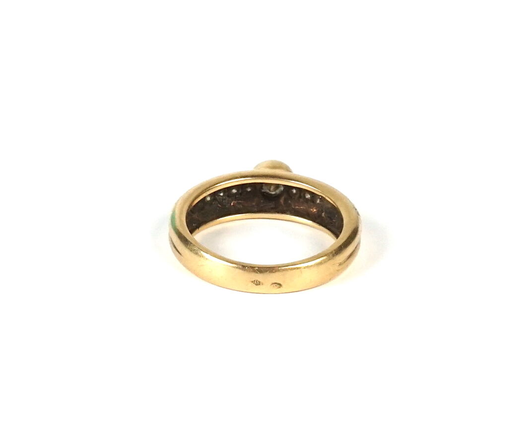 Bague "Jonc" en or jaune 18K (750/oo), ornée au centre d'un diamant taille moderne serti semi-clos, calibrant 0.2 carat environ, épaulé de 2 lignes de 4 diamants en serti rail (usures). TDD 55.5. Poids brut : 6.1 g environ.