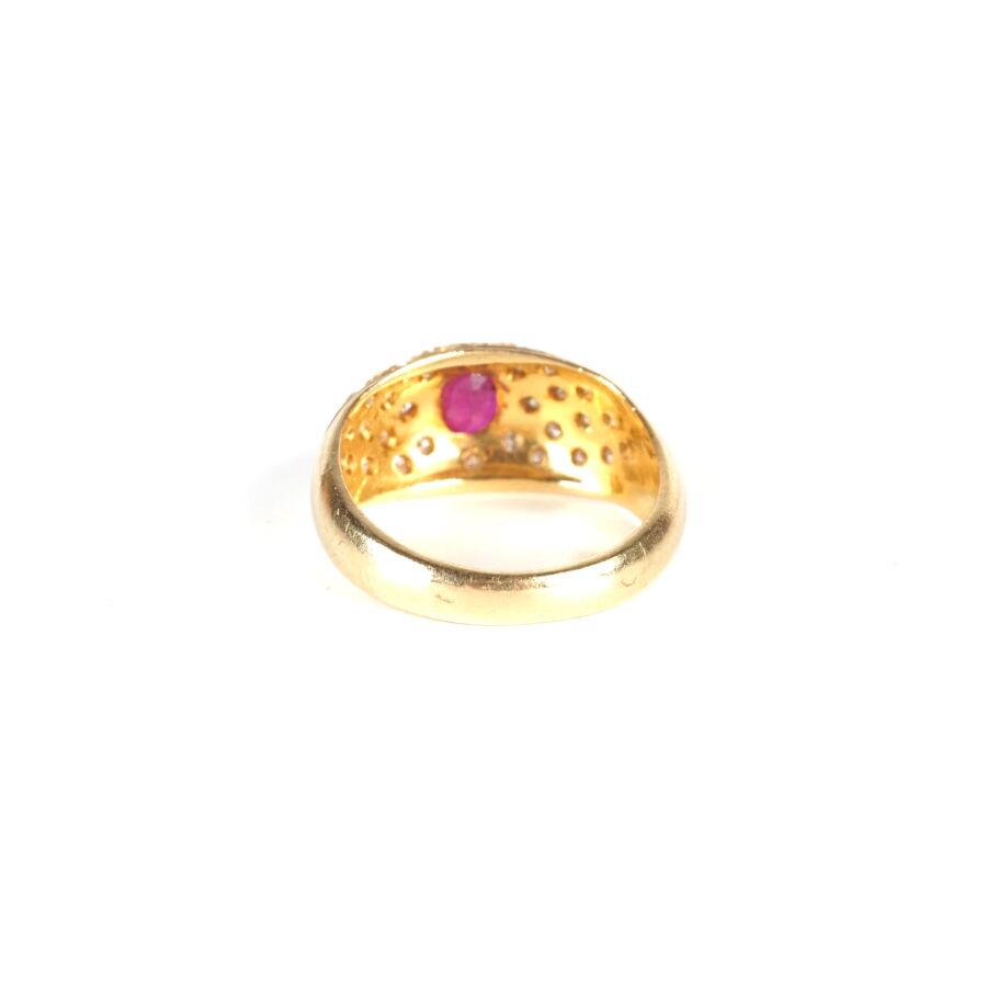 Bague jonc en or jaune 18K (750/oo), ornée au centre d'une pierre rouge de taille ovale (4 x 5 mm), probablement un rubis dans un entourage guilloché orné de 28 petits diamants, TDD. 49.5/50. Poids brut : 4.4 g environ (légères rayures et infimes égrenures non visibles à l'oeil nu).