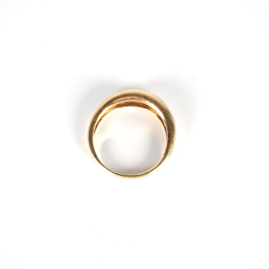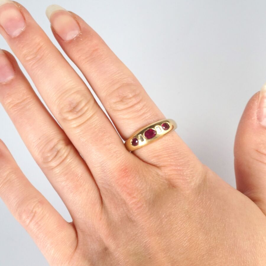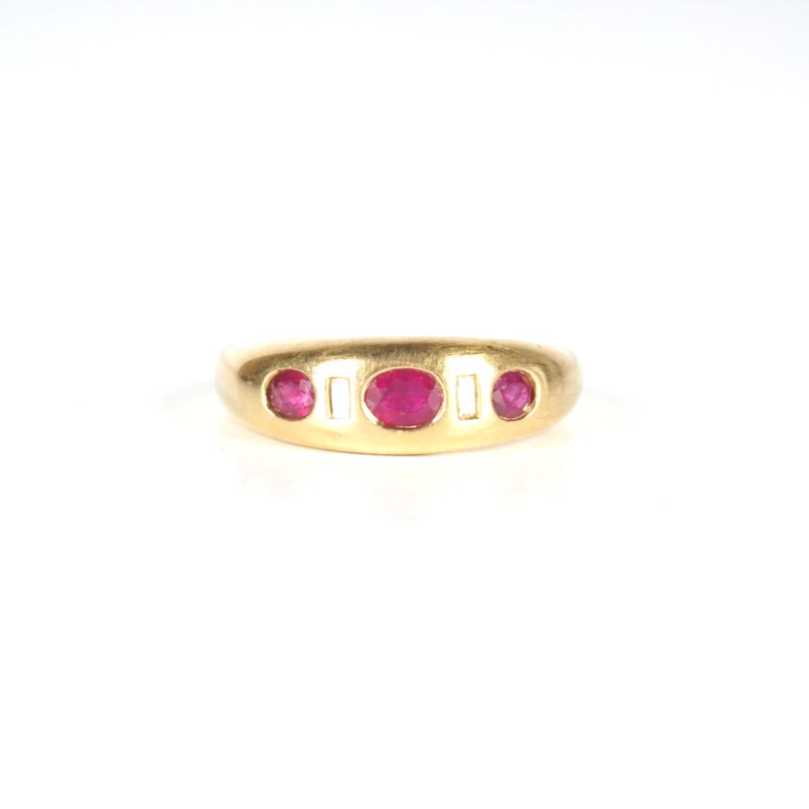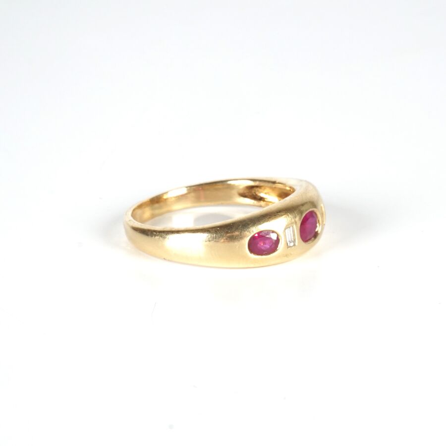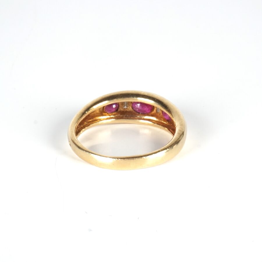 Bague jonc en or jaune 18K (750/oo), plateau légèrement bombé sertie de trois rubis (D. Central : 4.8 x 3.5 mm et D. Deux qui l'encadrent : 3.5 x 2.5 mm) alternés de deux zircons de taille baguette (D. 2.5 x 1.5 mm), Larg. 7 mm. TDD. 61. Poids brut : 5.4 g environ.