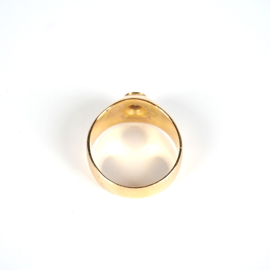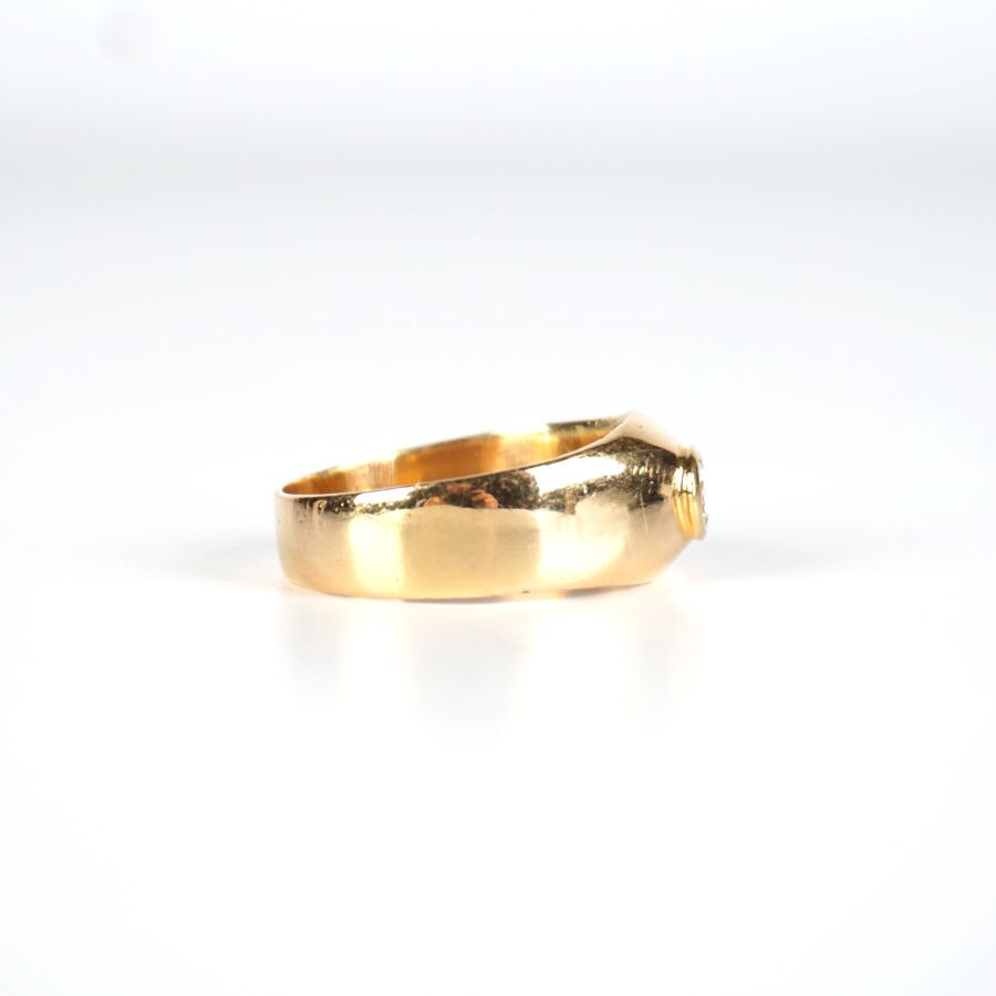 Bague jonc en or jaune 18K (750/oo) sertie clos d'un diamant taille brillant calibrant 0.35 cts environ (D. 4.5 mm), TDD. 68/68.5. Larg. 1.1 cm. Poids brut : 10.2 g environ.