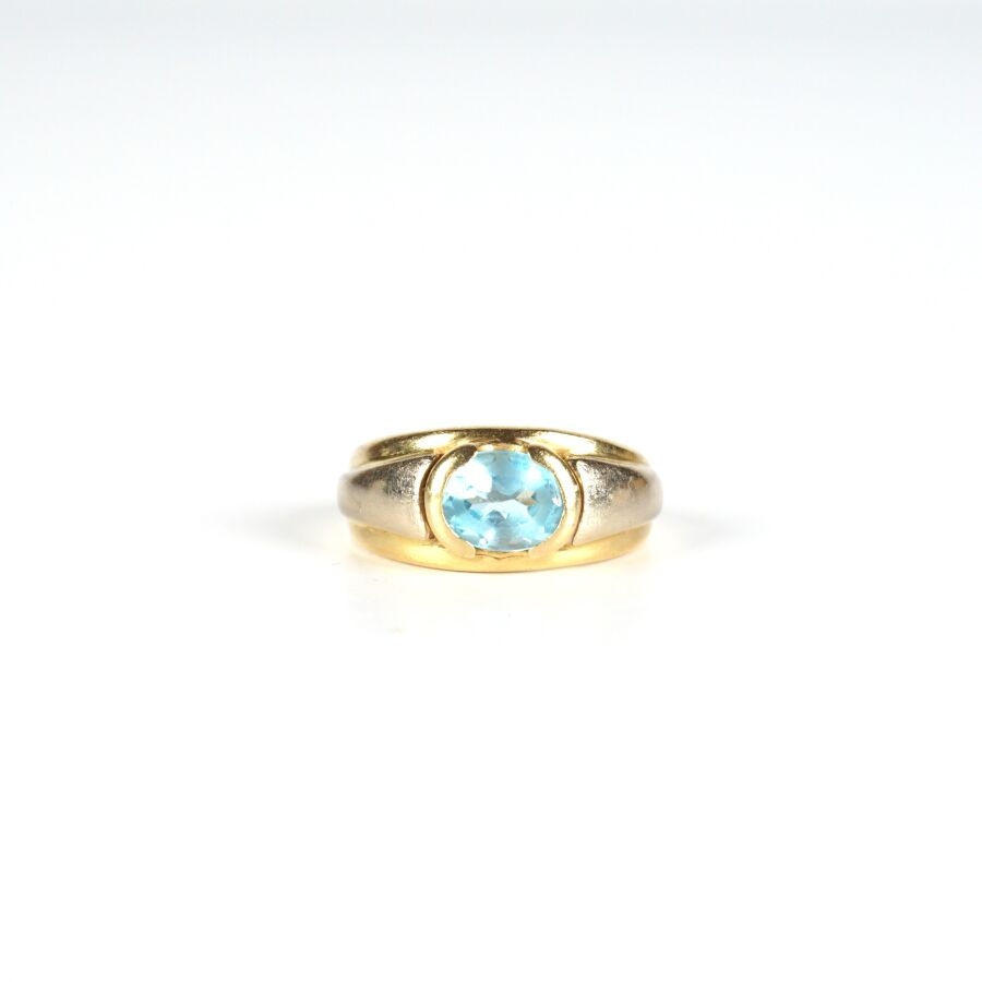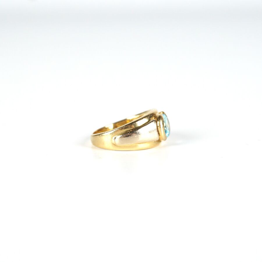 Bague jonc en or jaune 18K (750/oo) sertie clos d'une topaze facettée de taille ovale (D. 7 x 6 mm), TDD. 51/51.5. Larg. 9.5 mm. Poids brut : 6.4 g environ (usures à la pierre).