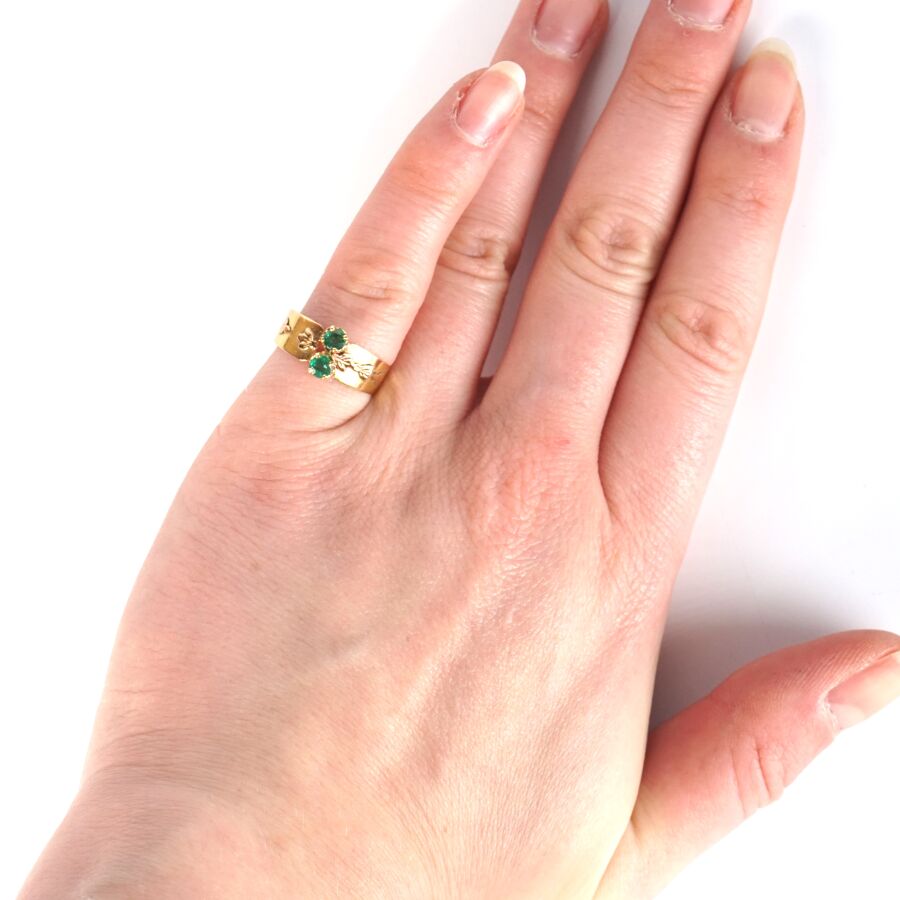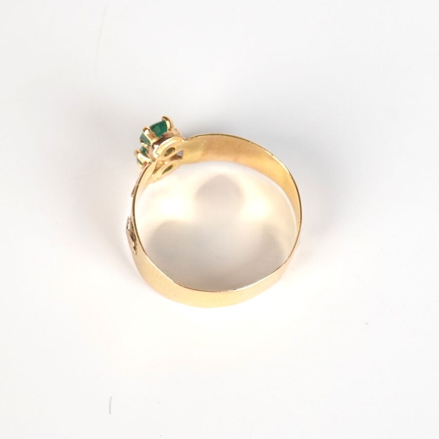 Bague jonc en or jaune 18K (750/oo), sertie de deux petites pierres vertes, probablement de synthèse calibrant 0.10 ct environ, à décor de petites palmettes (un manque), TDD. 52. Poids brut : 1.7 g environ.
