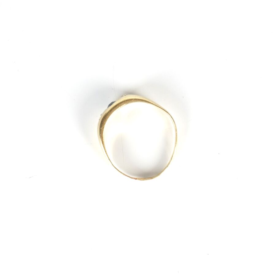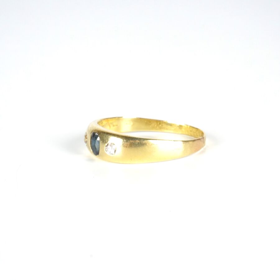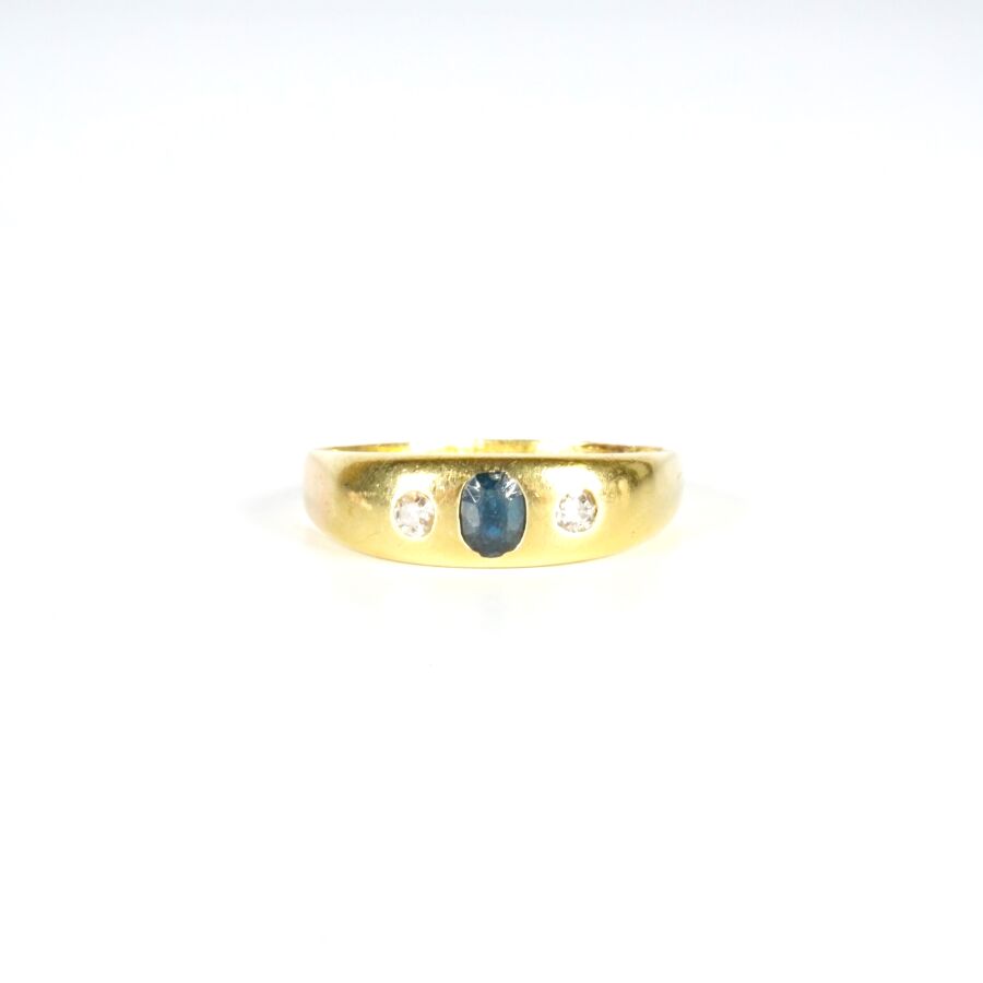 Bague jonc en or jaune 18K (750/oo) sertie d'un saphir bleu de taille ovale (D. 4.5 x 3.5 mm) encadré de deux diamants ronds taille ancienne (D. 2.3 mm), TDD. 62. Larg. 7.5 mm. Poids brut : 3.8 g environ (déformations à l'anneau et égrenures).