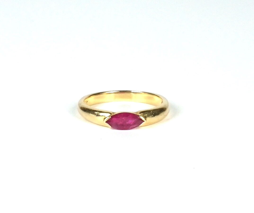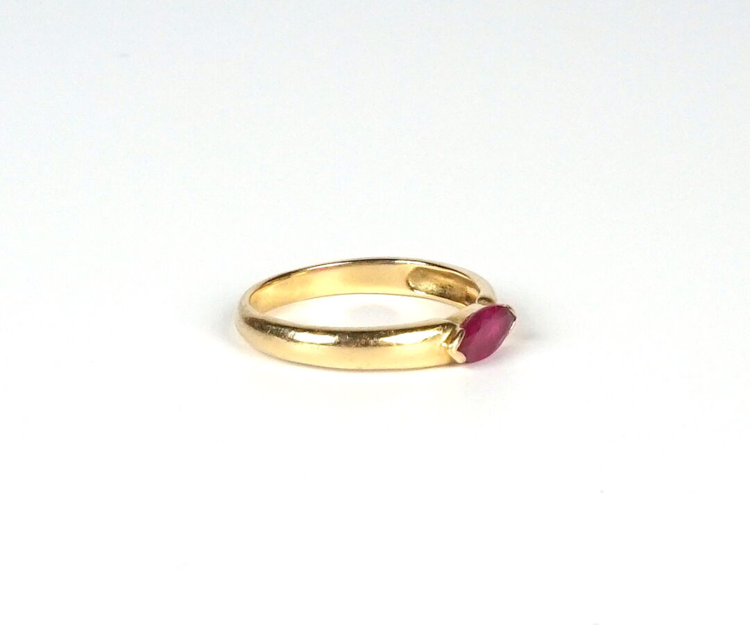 Bague "Jonc" en or jaune 18K (750/oo), sertie d'une pierre rouge-rose taille navette (8 x 4 mm), probablement un rubis. TDD 56. Poids brut : 3.4 g environ.