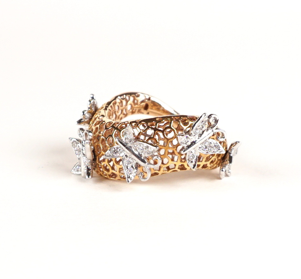 Bague Jonc sinueux en résille d'or jaune 18K (750/oo) agrémentée de cinq motifs de papillons en or gris 18K (750/oo) sertis de diamants taille brillant (4 mobiles). TDD 53. Poids brut : 5,4 g.