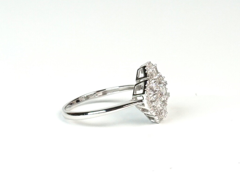 Bague losangée ajourée en or blanc 18K (750/oo) sertie de 17 diamants blancs taille tapers 0.10 ct et de 74 diamants blancs ronds 0.15 ct. TDD 54.5. Poids brut : 2.6 g environ.