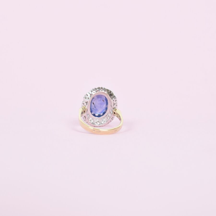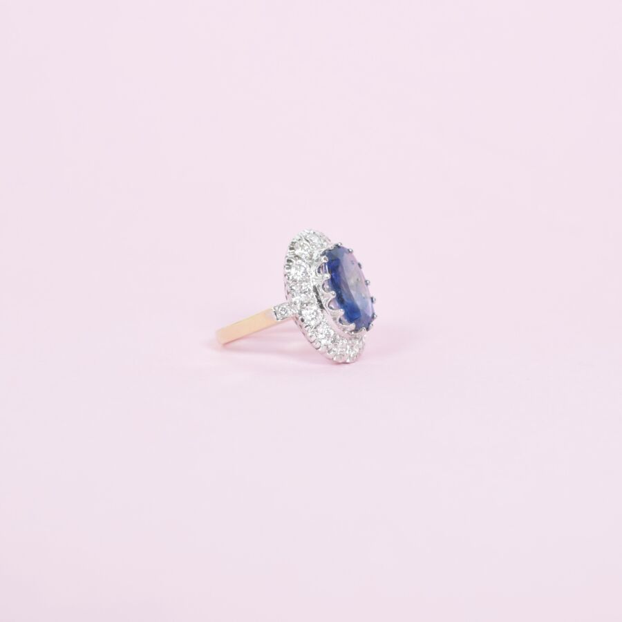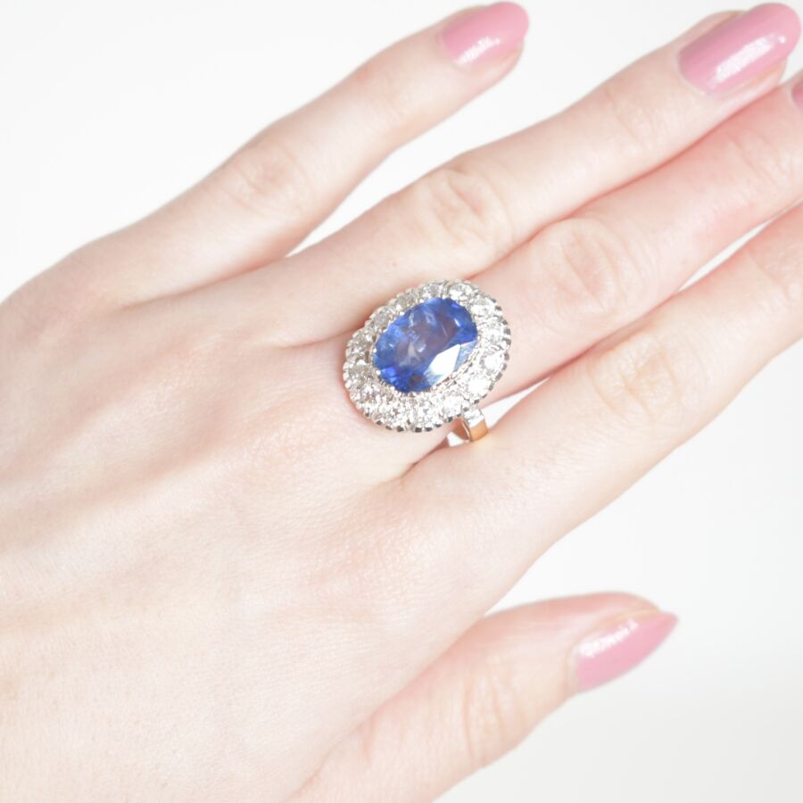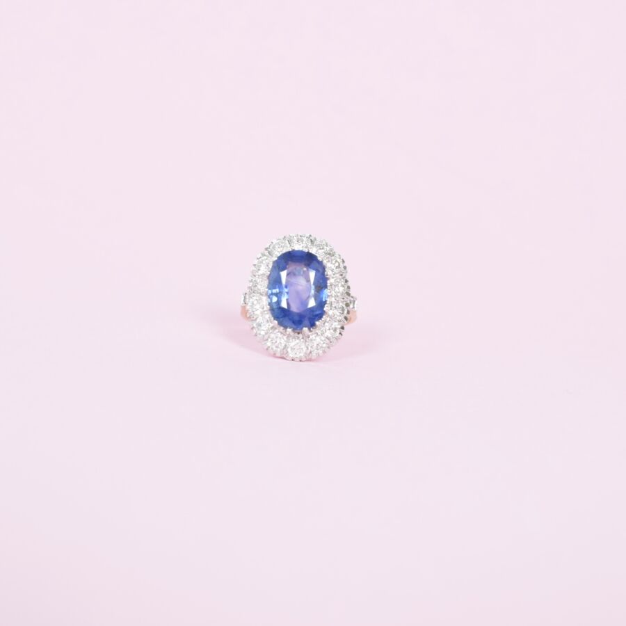 Bague "Marguerite" en or 18K (750/oo) ornée d'un saphir de Ceylan (Sri Lanka) naturel bleu profond taille coussin calibrant 5.54 cts, entouré d'un double entourage de diamants taille brillant pour un total d'environ 1.3 ct. Poids brut : 7 g.
