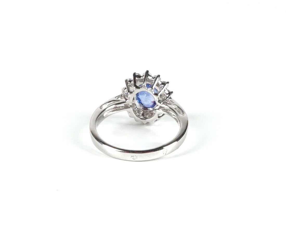 Bague "Marguerite" en or blanc 18K (750/oo), sertie au centre d'un saphir taille ovale pesant 1.20 ct, agrémenté de 14 diamants blancs taille moderne pesant ensemble 0.40 ct, Dim. du motif : 1.2 x 1 cm. TDD 54. Poids brut : 3.95 g environ.