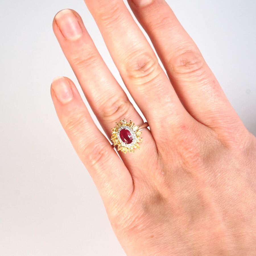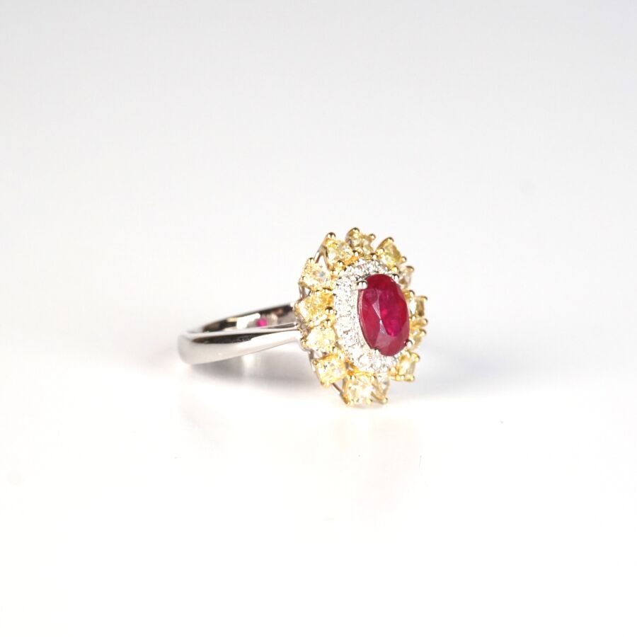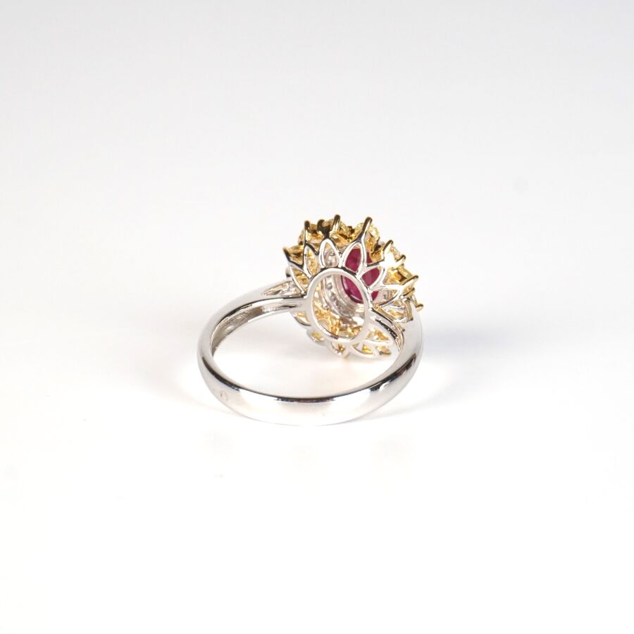 Bague "Marguerite" en or de 2 tons 18K (750/oo), sertie au centre d'un rubis taille ovale calibrant 0.95 ct environ (4.5 x 7 mm), serti griffe, dans un double entourage de 18 diamants blancs taille moderne calibrant ensemble 0.10 ct environ et de 13 diamants "champagne" de diverses taille calibrant au total 0.9 ct environ, TDD : 52.5. Dim . Tête de bague : 15 x 13 mm. Poids brut : 4.2 g environ.