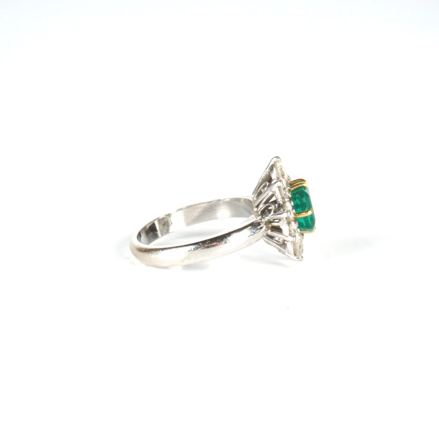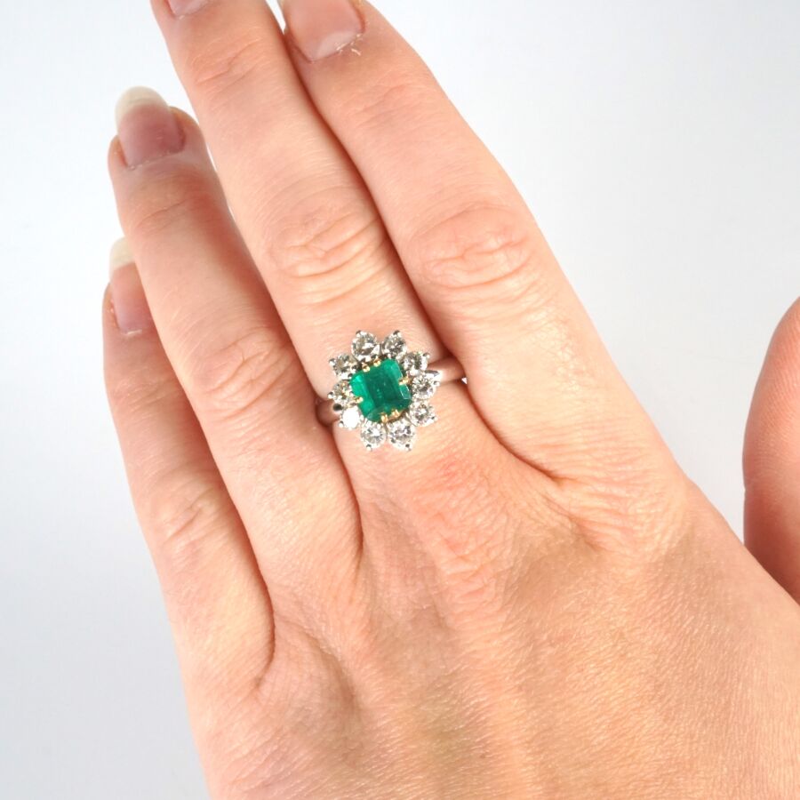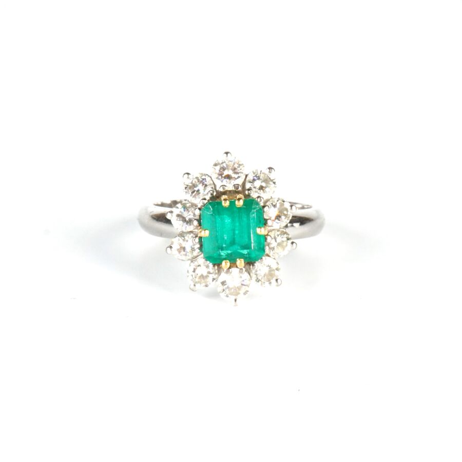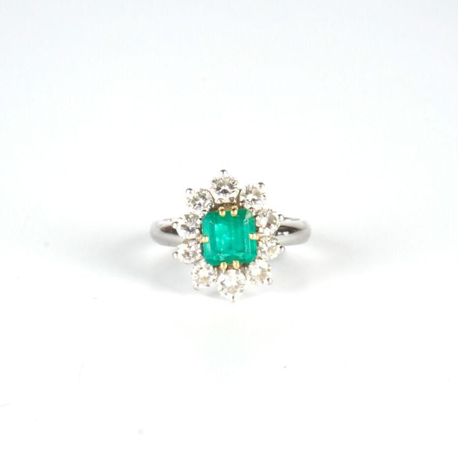 Bague "Marguerite" en or gris 18K (750/oo) sertie au centre d'une émeraude taille asscher calibrant 1.5/1.7 cts environ (D. 6.5 x 6.5 mm) dans un entourage de 10 diamants taille brillant calibrant 0.1 cts environ chaque (D. 3 mm), Dim. Tête de bague : 1.6 x 1.4 cm. TDD. 56. Poids brut : 6.9 g environ.