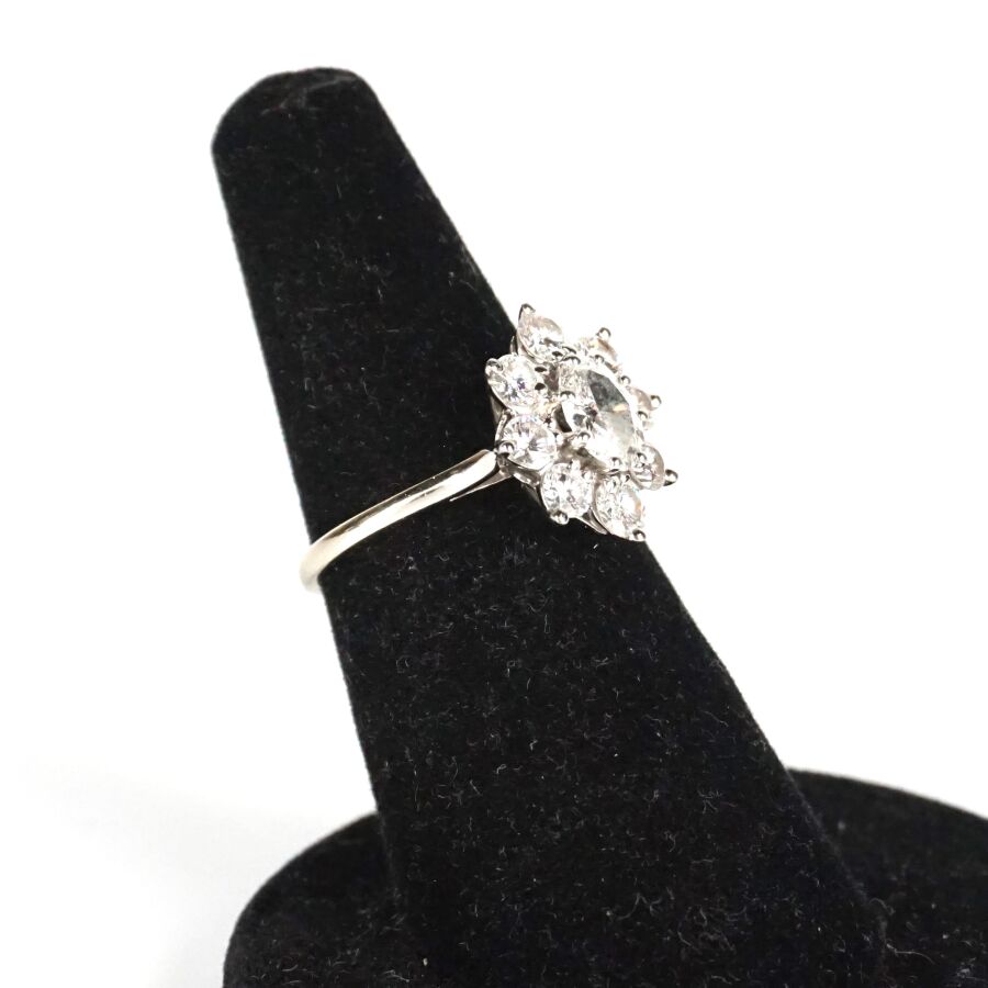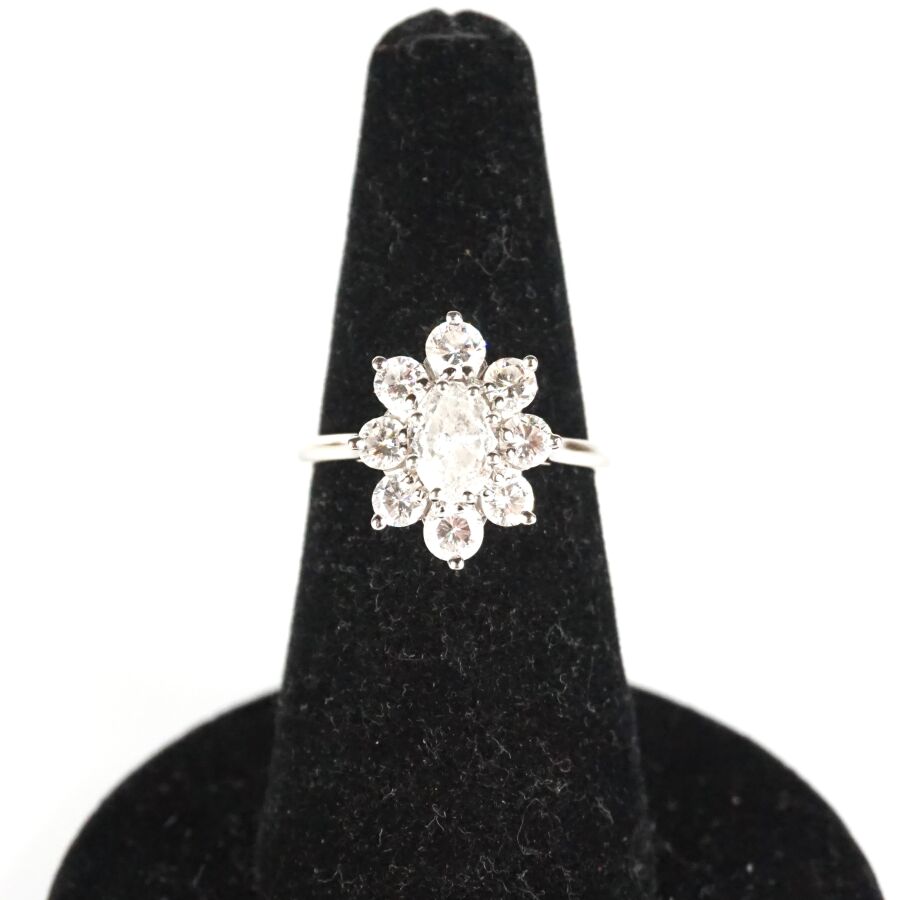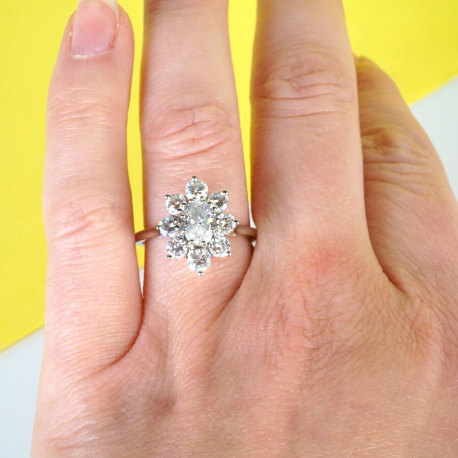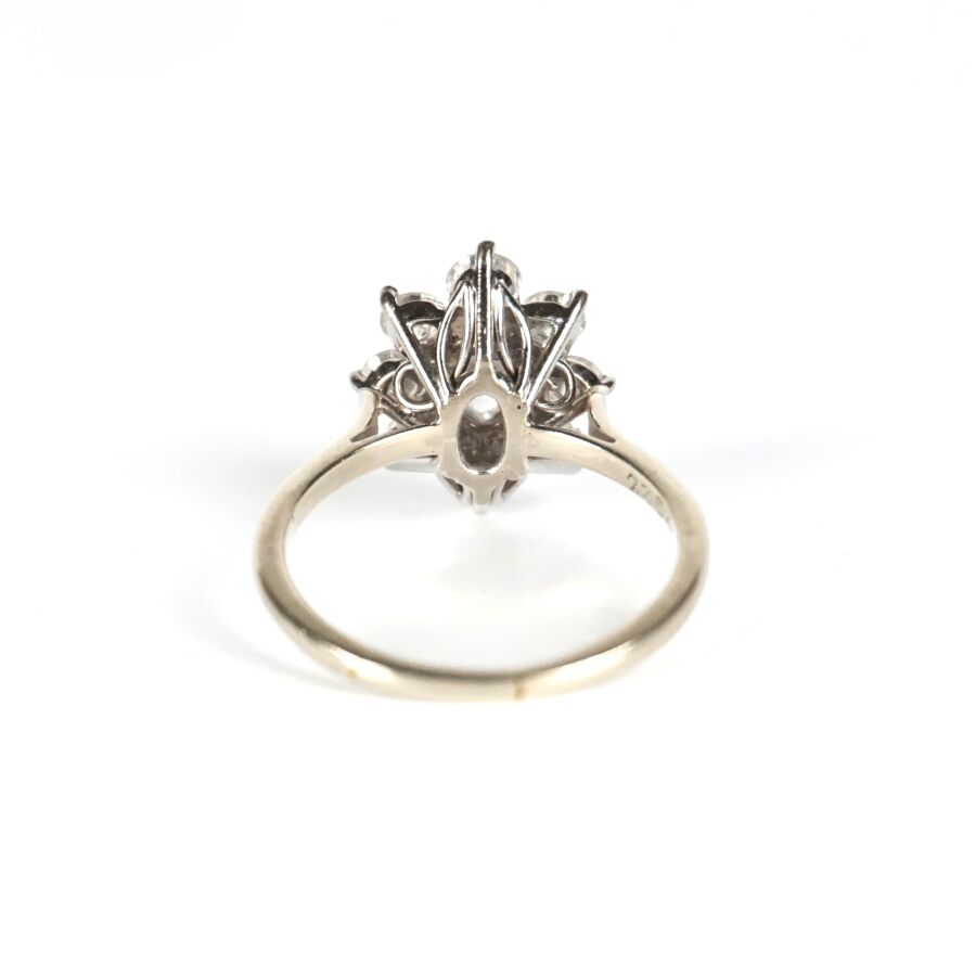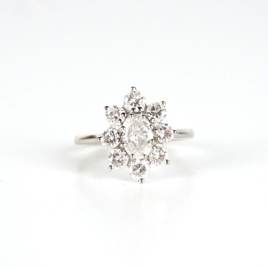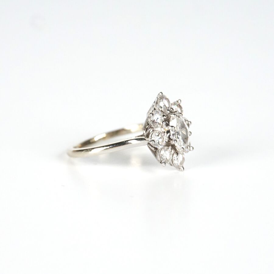 Bague "Marguerite" en or gris 18K (750/oo), sertie au centre d'un diamant de taille ovale calibrant 0.7 cts environ (D. 7 x 5 mm) légèrement teinté, probablement gamme "Faint Yellow", dans un entourage de 8 diamants taille brillant calibrant 0.2 cts chaque environ (D. 4 mm), Dim. Tête de bague : 1.5 x 1.2 cm. TDD. 55. Poids brut : 4 g environ (inclusions).