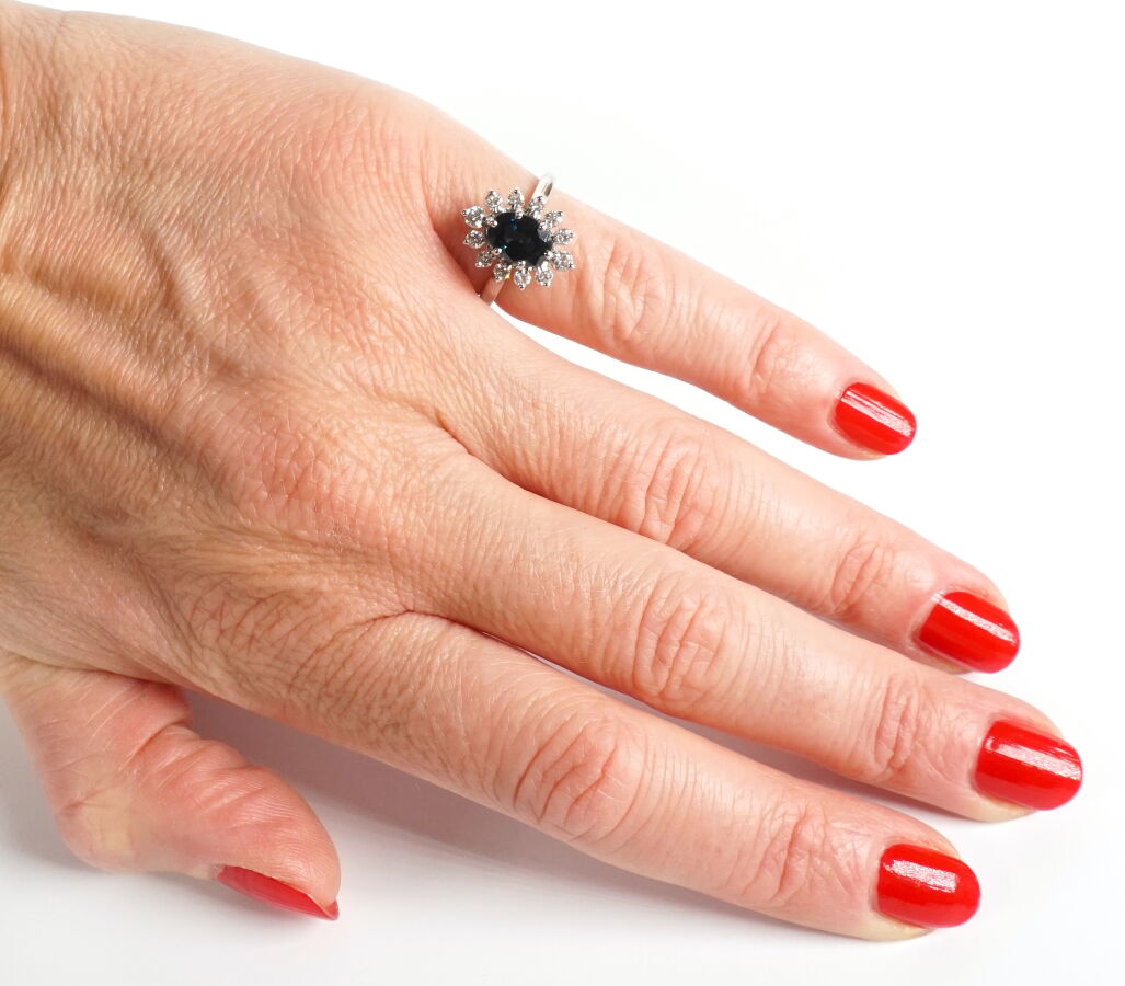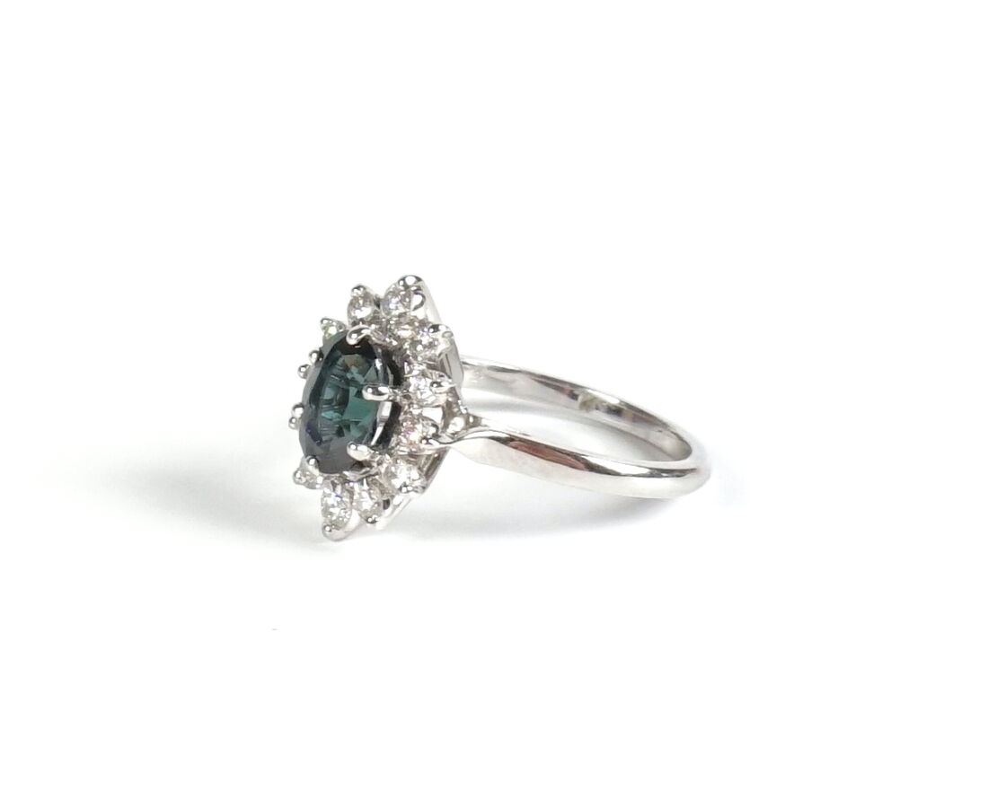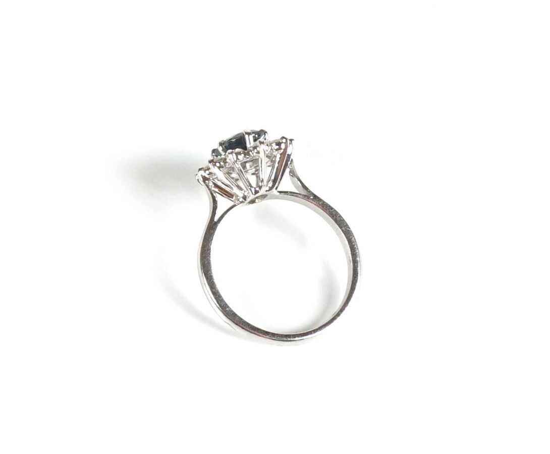 Bague "Marguerite" en or gris 18K (750/oo), sertie d'un saphir taille ovale (8 x 6 mm), dans un entourage de 12 diamants calibrant 0.02 et 0.03 carat environ. TDD 51.5. Poids brut : 3.9 g environ.