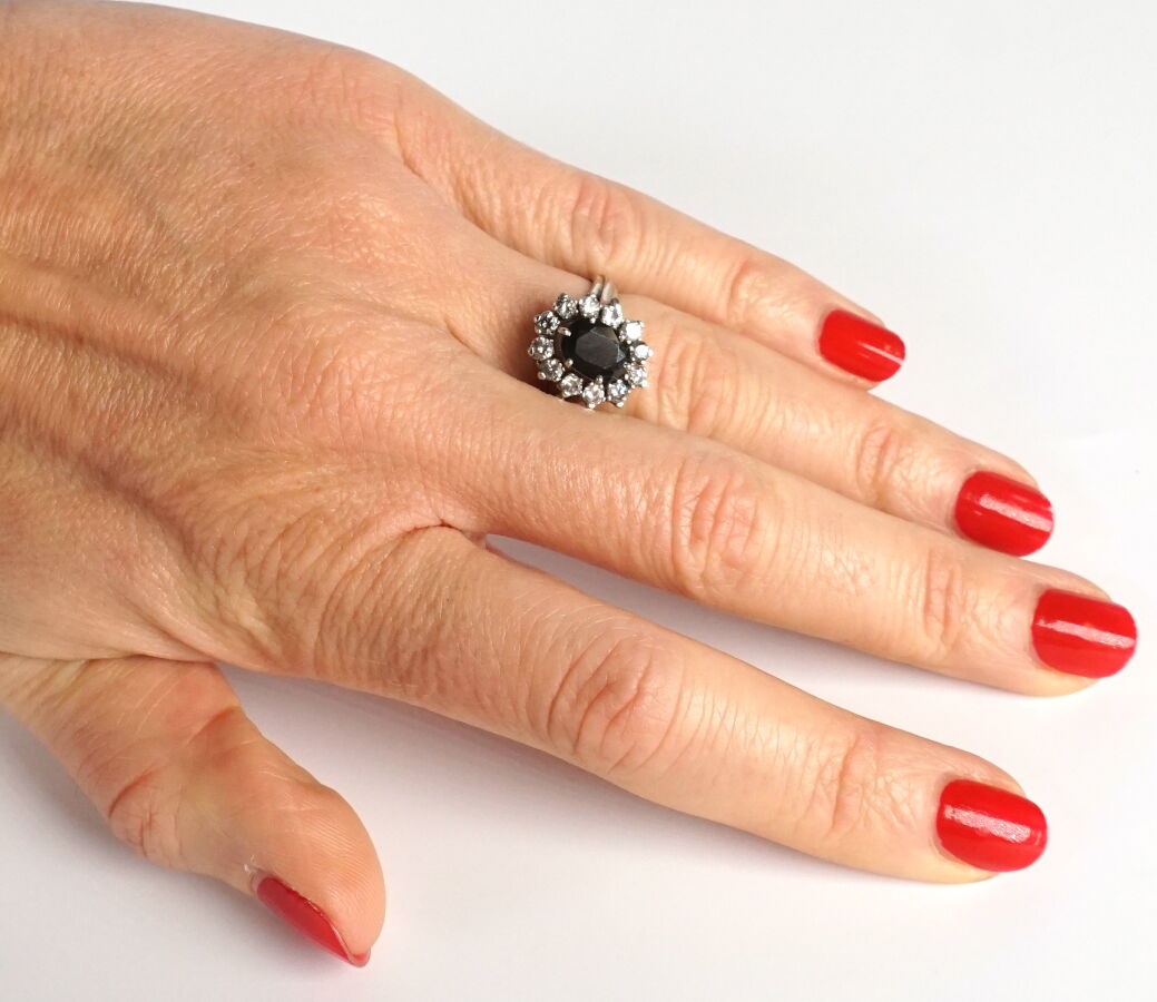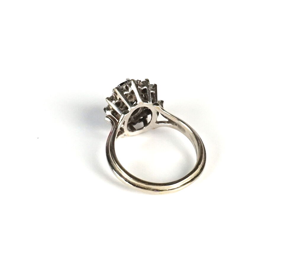 Bague "Marguerite" en or gris 18K (750/oo), sertie d'un saphir taille ovale (8 x 6 mm), dans un entourage de 12 petits diamants ronds calibrant 0.04 carat chaque environ. TDD 57. Poids brut : 7.2 g environ.