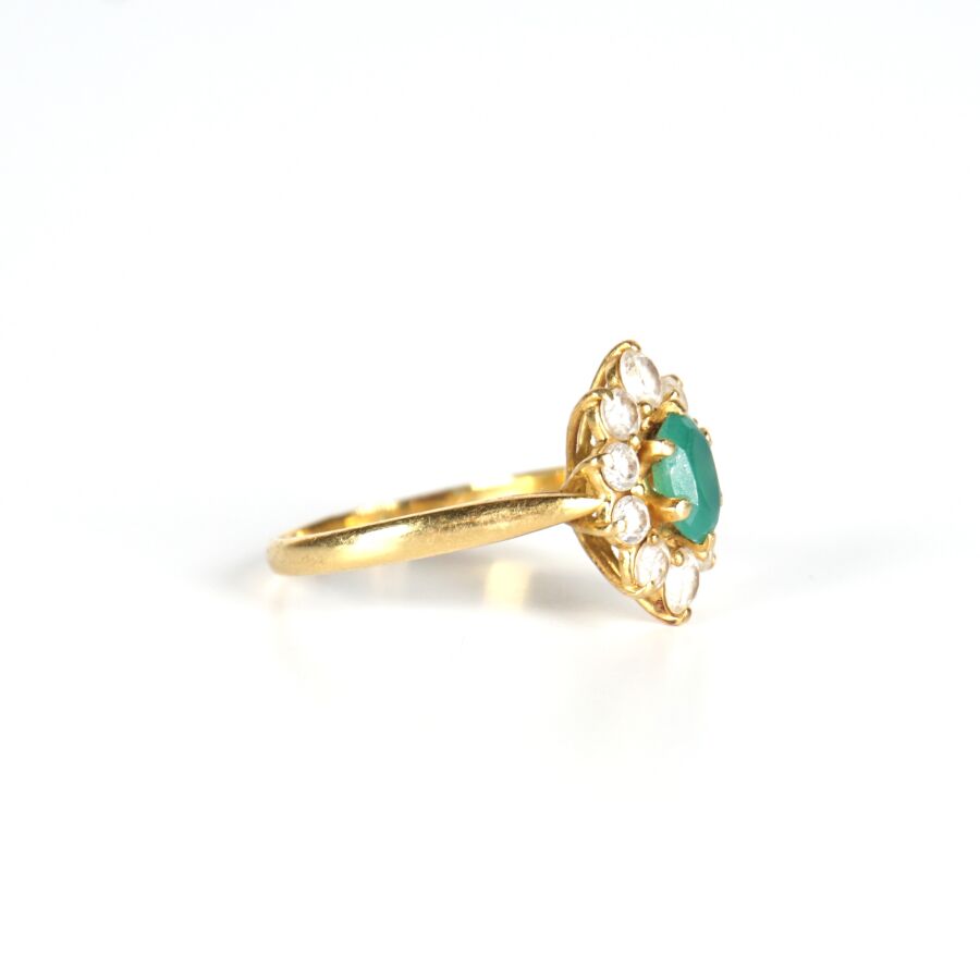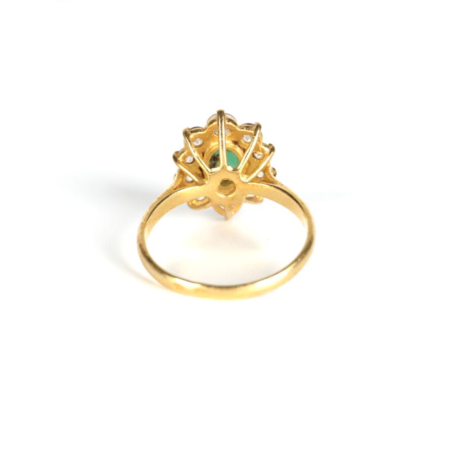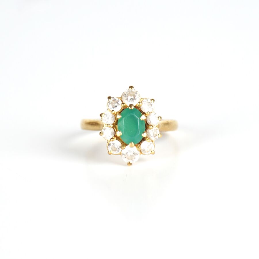 Bague "Marguerite" en or jaune 18K (750/oo), sertie au centre d'une chrysoprase verte de forme ovale (D. 7 x 5 mm) dans un entourage de 10 pierres blanches imitant le diamant, TDD. 55.5/56. Dim. Tête de bague : 1.5 x 1.2 cm. Poids brut : 3.9 g environ.