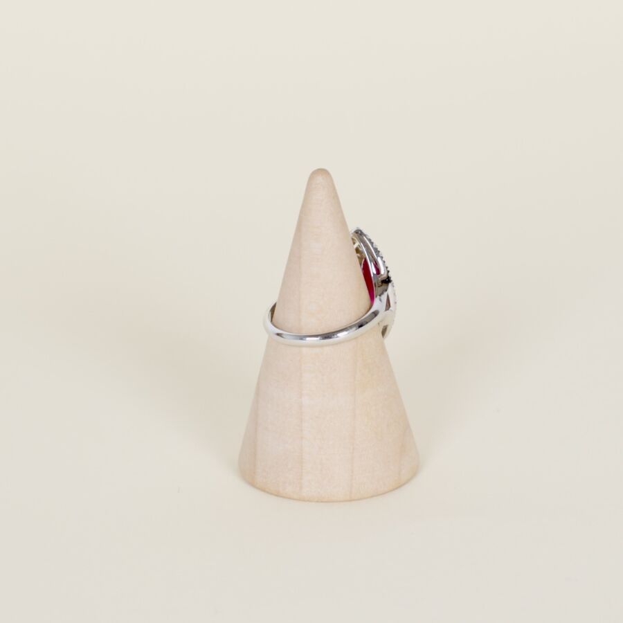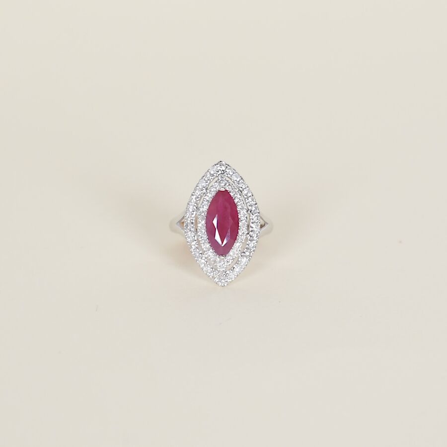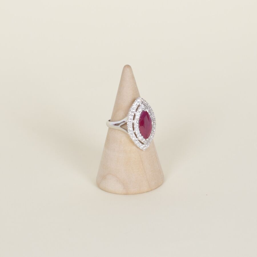 Bague "Marquise" en or 18K (750/oo), centrée d'un rubis birman taille amande (D. 12 x 5 mm), calibrant 2.2 ct environ, dans double entourage de diamants taille moderne pour 0.6 ct environ. TDD : 52. Poids brut : 3.6 g environ.
