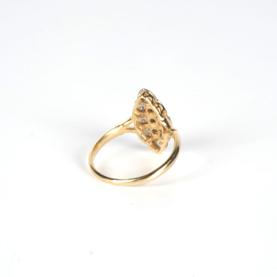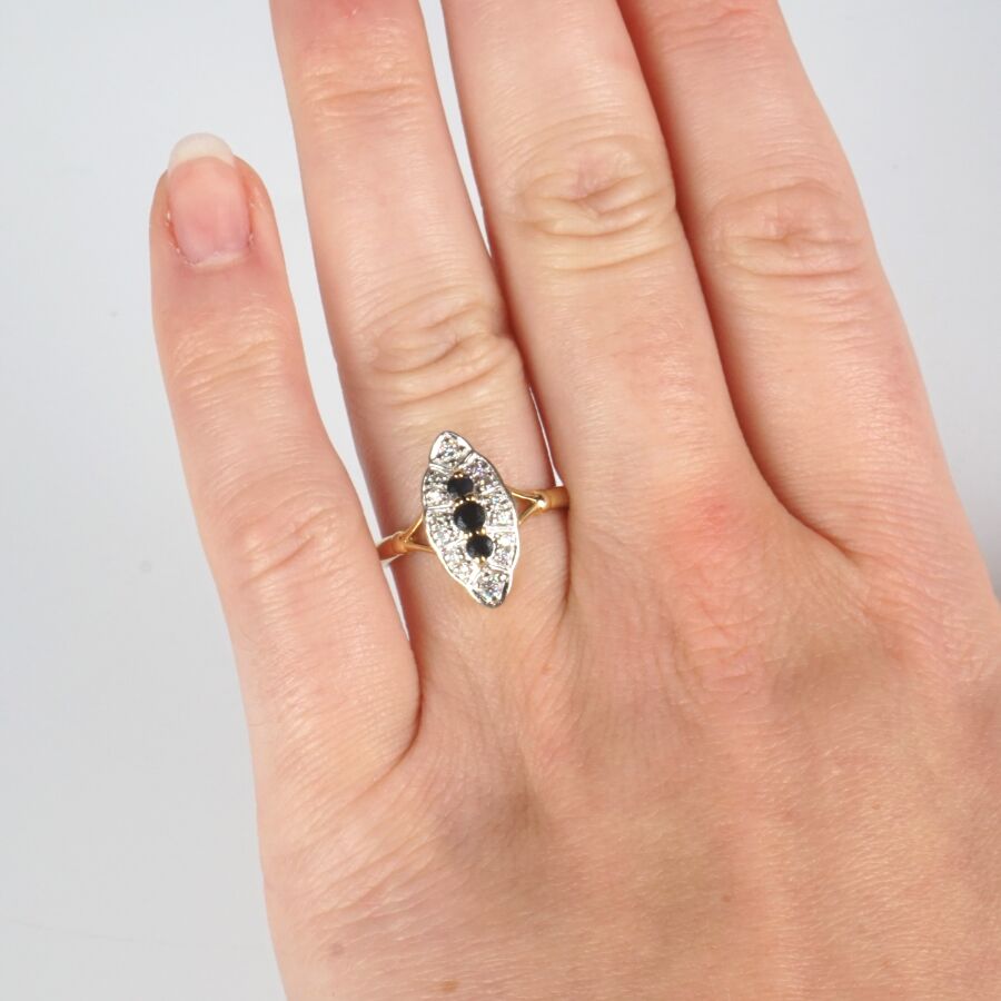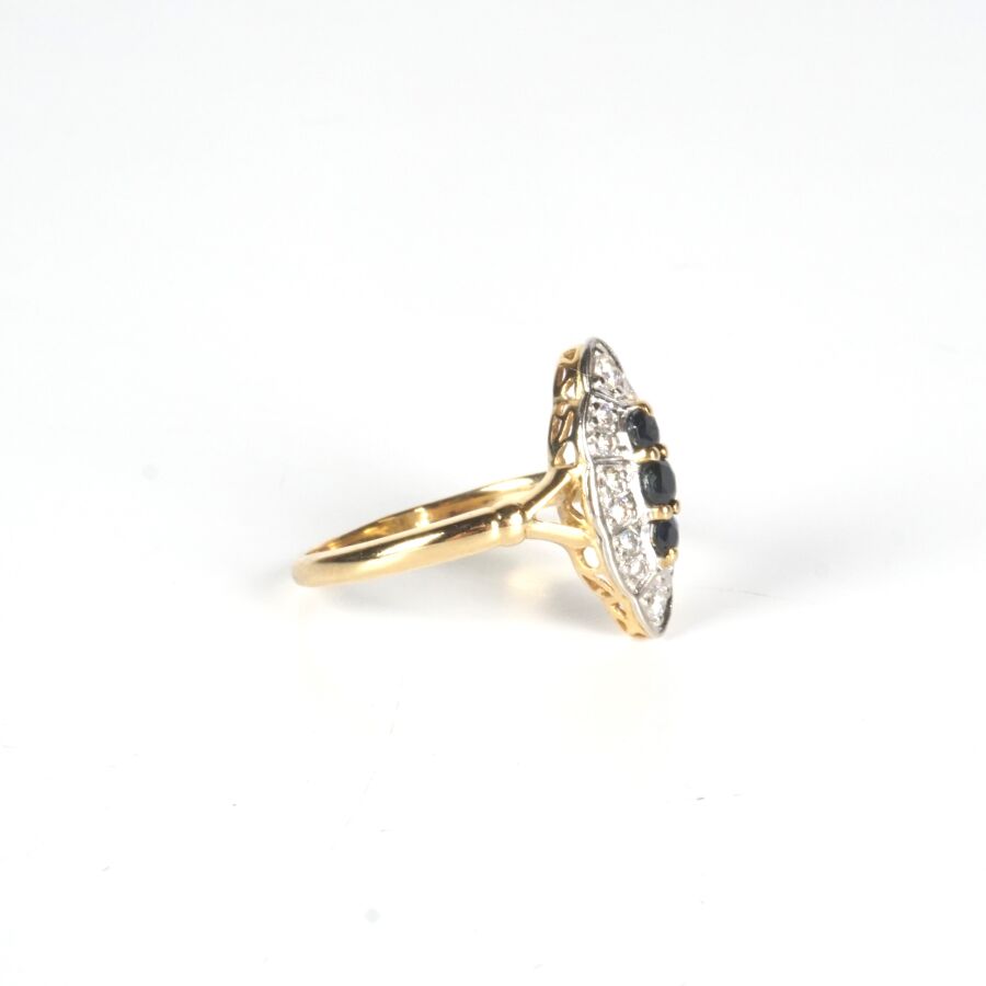 Bague "Marquise" en or jaune 18K (750/oo) et platine (850/oo), sertie de trois saphirs ronds de couleur bleu (D. 2 mm et 2.5 mm) dans un entourage de 14 petits diamants, Dim. Tête de bague : 1.7 x 0.8 cm. TDD. 56/56.5. Poids brut : 3.4 g environ.