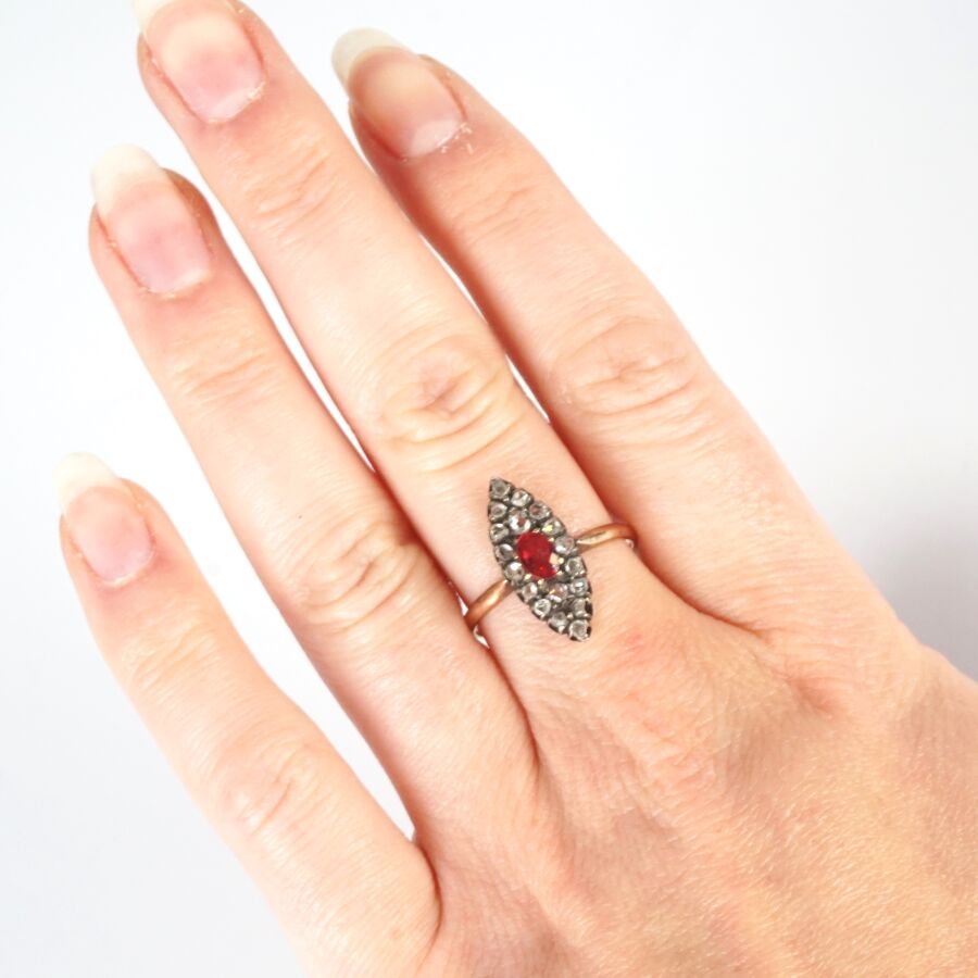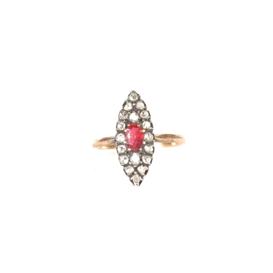 Bague "Marquise" en or jaune 18K (750/oo), le plateau centré d'une pierre rouge de taille ovale, probablement un rubis (D. 5 x 3.5 mm), dans un entourage de 18 diamants taille rose, Dim. Tête de bague : 2 x 0.8 cm. TDD. 59.5/60. Poids brut : 2.5 g environ (petites égrisures).