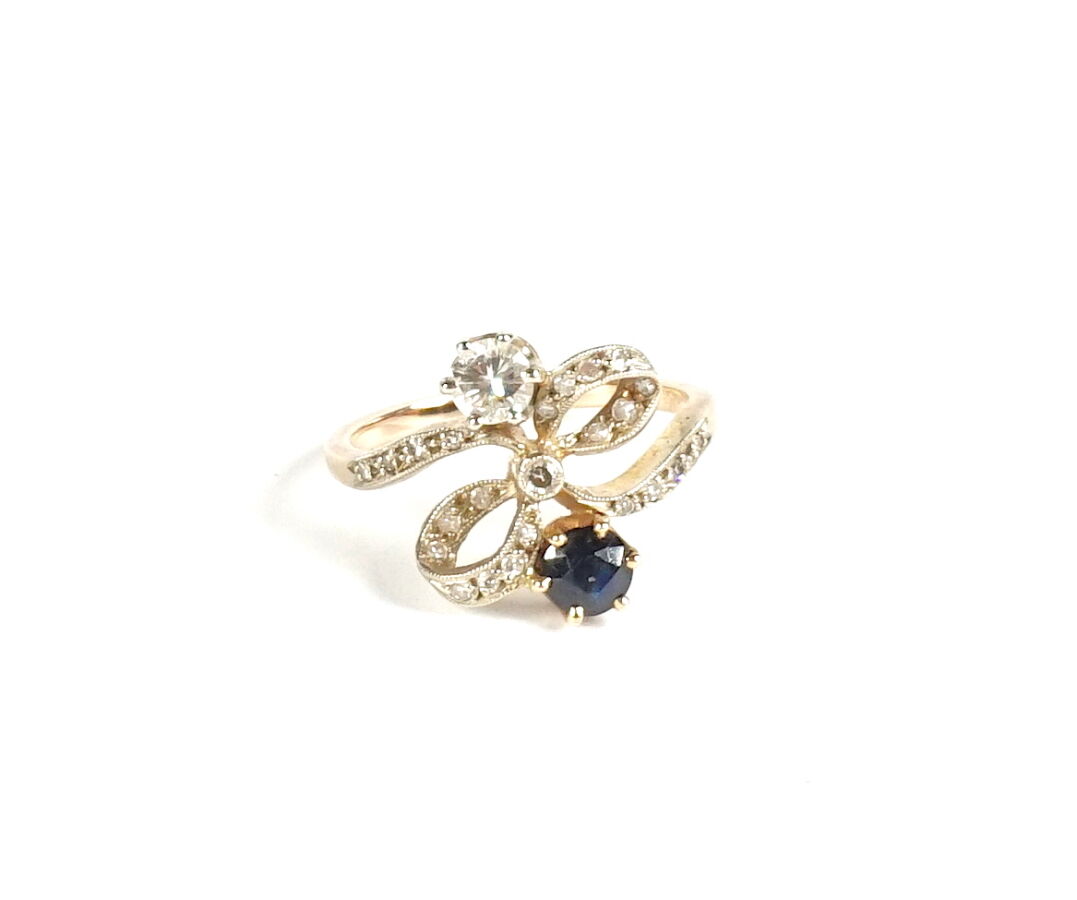 Bague "Noeud" en or jaune 18K (750/oo), le motif entièrement serti de petits diamants taille rose et épaulé d'un diamant rond taille moderne calibrant 0.20 carat environ et d'une pierre bleue taille ronde, probablement un saphir. TDD 54. Poids brut : 3.4 g environ.
