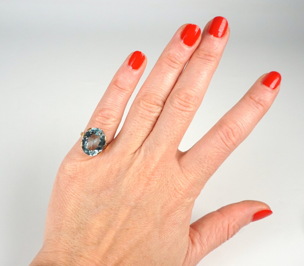 Bague ovale en or jaune 18K (750/oo), sertie griffes d'une pierre bleue taille ovale (16 x 12 mm), probablement une aigue-marine (une rayure sur le dessus de la pierre). TDD 51. Poids brut : 5.2 g environ.