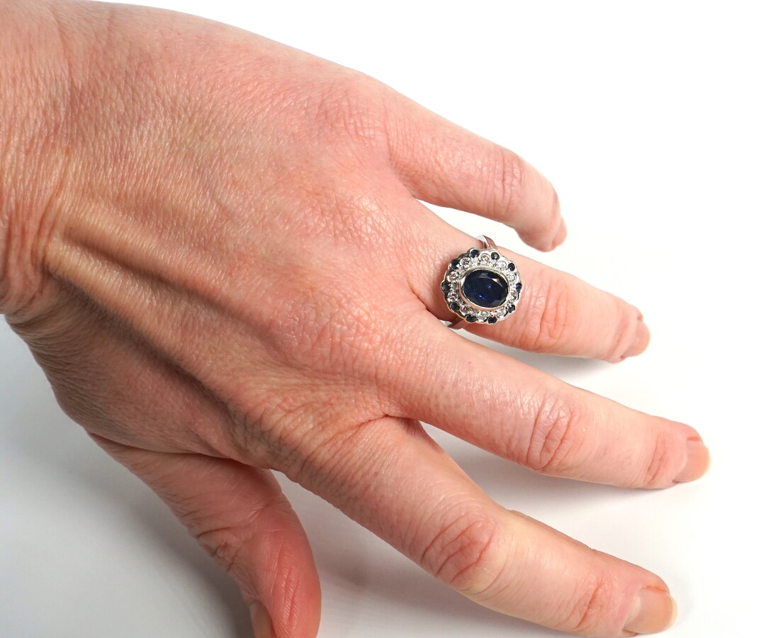 Bague ovale "Festonnée" en or blanc 18K (750/oo), sertie au centre d'un saphir taille ovale calibrant 2.65 cts, agrémenté de 10 diamants blancs taille moderne pour 0.30 ct alternés de 10 saphirs ronds pour 0.30 ct. TDD 54. Poids brut : 4.85 g environ.
