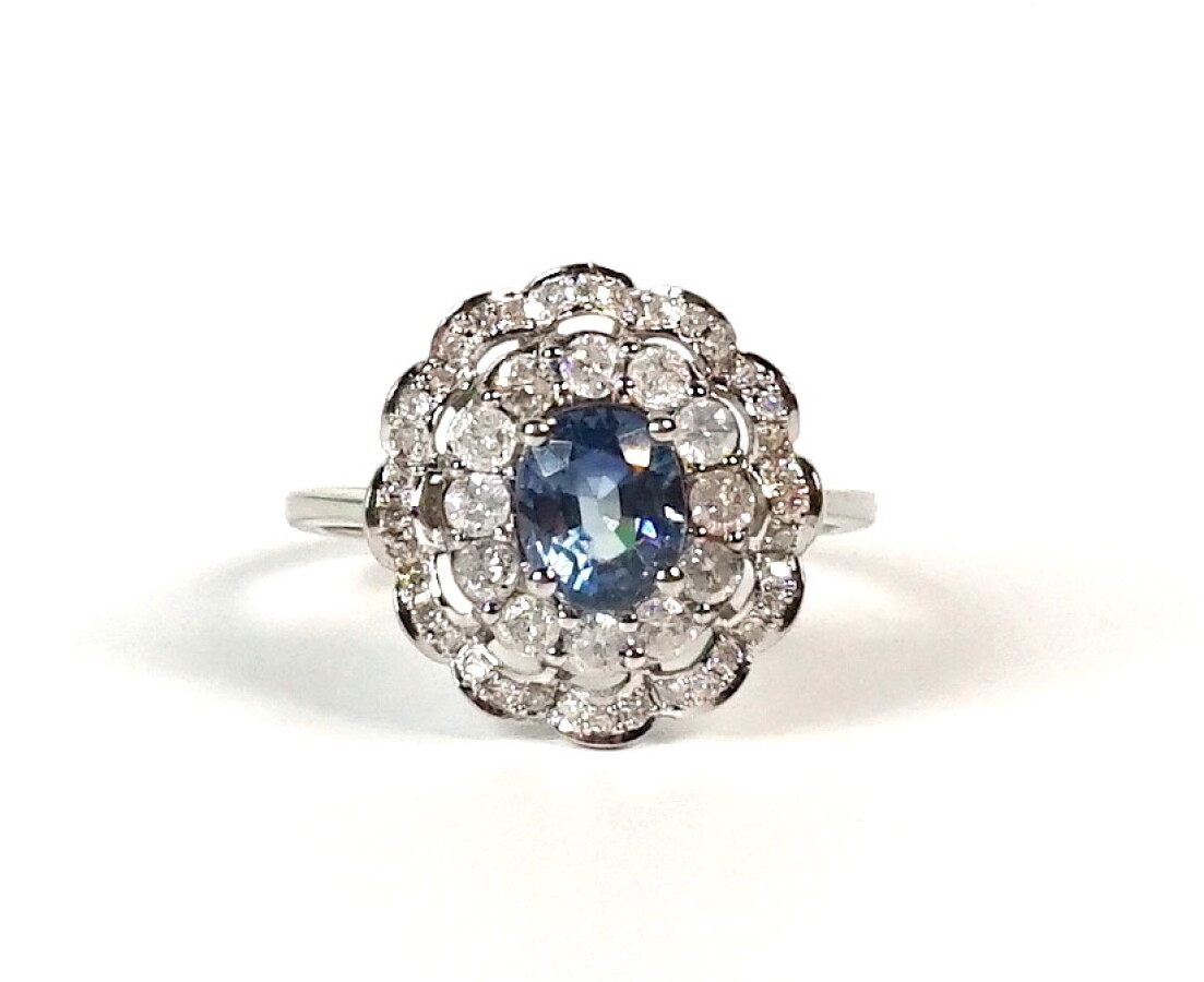 Bague ovale "Festonnée" en or gris (750/oo) sertie au centre d'un saphir taille ovale calibrant 0.5 ct environ, entouré de diamants pour 0.55 ct, Dim. motif : 1.4 x 1.5 cm. TDD 52.5. Poids brut : 3 g environ.